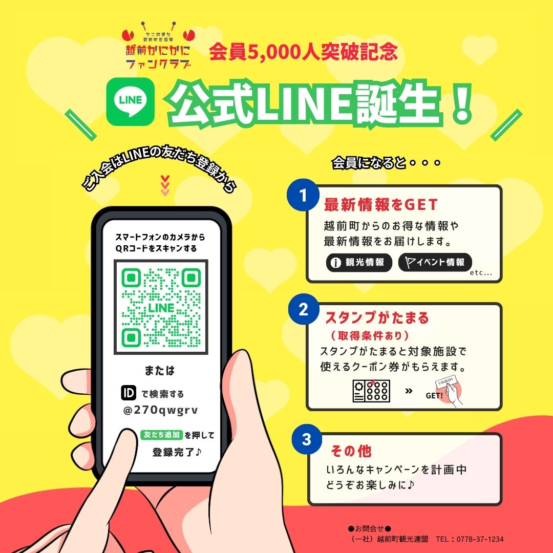 この度、ファンクラブ会員が5,000人を突破したことを記念し、新たにLINE公式アカウントを開設いたしました。福井県越前町の最新のイベント情報やおすすめ情報、旬のネタやお得な情報などをいち早くお届け予定です。