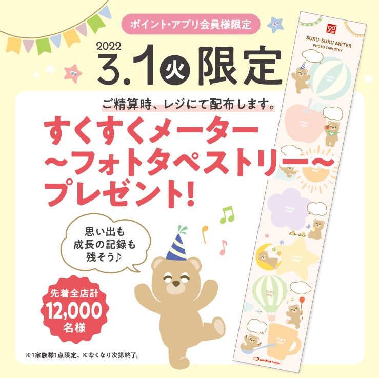 アニバーサリーベアのすくすくメーターは、お子さまの身長が測れる身長計としてだけでなく、写真やメッセージなども記録して思い出として残せるフォトタペストリーです。3月1日(火)限定で、12,000名様にプレゼントいたします。