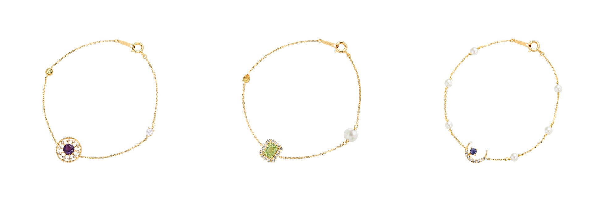 Cherimoから新たにブレスレットも登場。服装が軽やかになり、腕元のおしゃれが楽しめる春に向けて手に入れたいアイテムです。アメシストやペリドット、アイオライト、パールなど色とりどりのカラーストーンが可憐に煌めき、一つ一つの仕草を美しく彩ります。