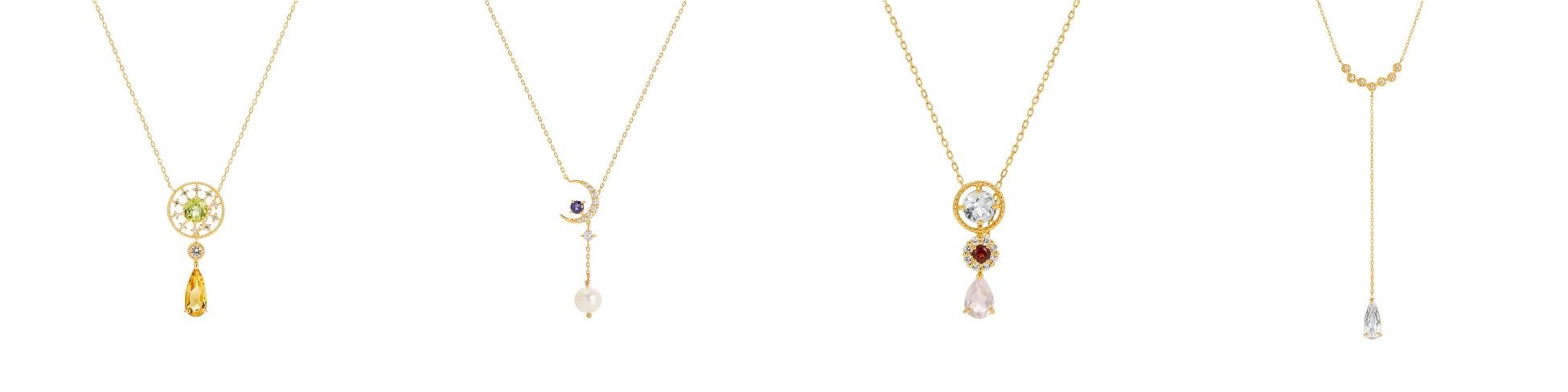 初登場となるラリエットネックレスは、動きに合わせてカラーストーンが揺れて煌めく優美なデザイン。