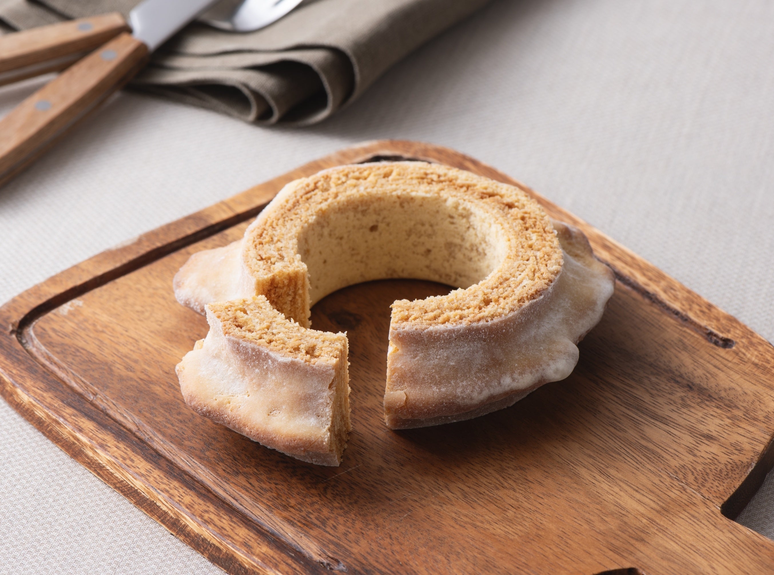 当式場は「思い出の場所は はじまりの場所となり 永遠の場所に変わる」というコンセプトストーリーを掲げ、新郎新婦様が結婚式を挙げた後も10年、20年経っても帰って来ることができる場所を目指しています。このコンセプトストーリーを実現していくためにも、結婚式場として持続可能な社会を目指す取り組みが必要であると考え、フードロス削減を目的として、本来廃材となってしまう国産の「米粉」や「バターミルク」を使用したサステナブルなバウムクーヘンを開発しました。生地は芳醇なバターの薫りとしっとりとした食感でありながら、外側はザクッとした食感が楽しめます。