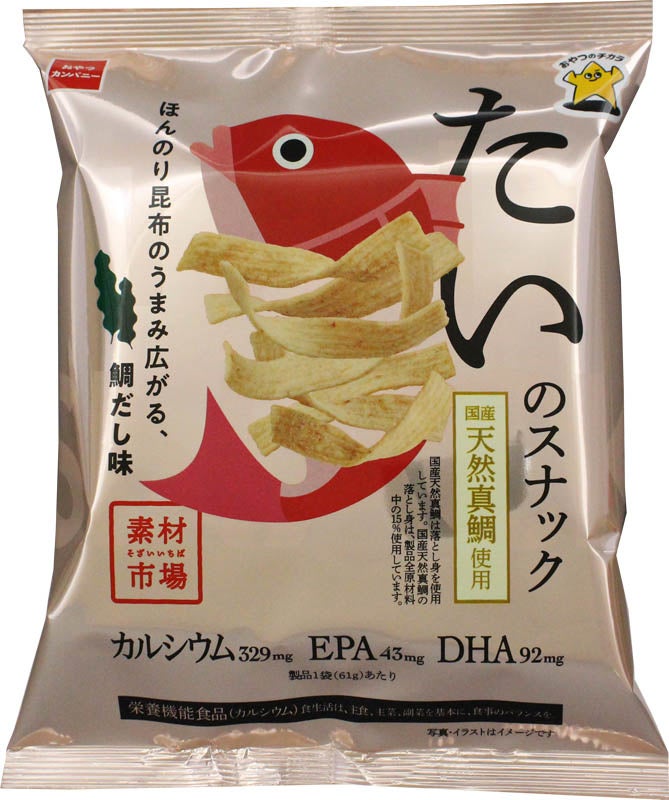 国産天然真鯛の落とし身を生地に練り込み、ほんのり昆布のうまみをきかせた鯛だし味に仕上げています。カリッサクッとしたスナック菓子らしい食感ながら、カルシウム、EPA、DHAの栄養成分も摂れるヘルシー感覚のおやつです。