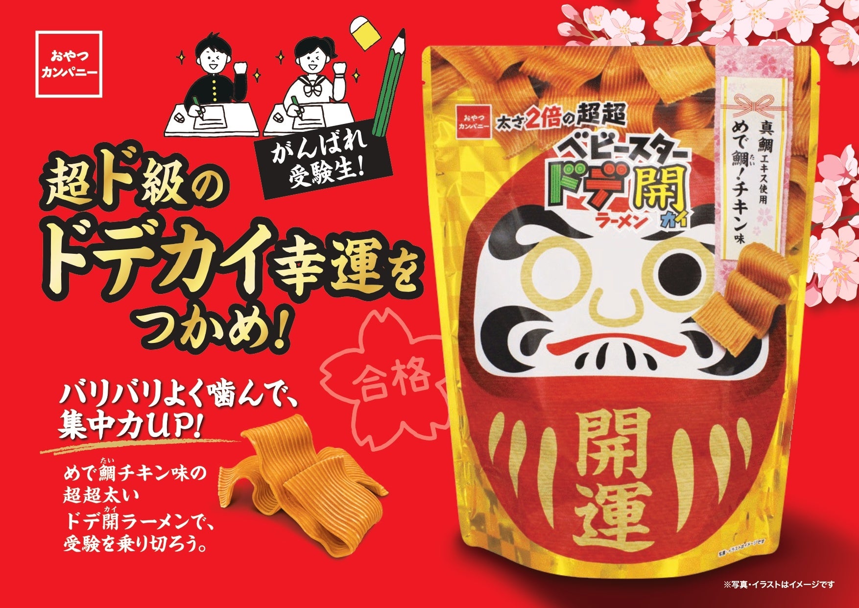 株式会社おやつカンパニー(所在地:三重県津市 代表取締役社長:手島文雄)は、がんばる受験生を応援する‟受験生応援商品”として「超超ベビースタードデ開ラーメン(めで鯛!チキン味)」を、2021年12月20日(月)より全国にて発売します。幅広くてつまみやすいドデカイラーメンを約2倍の幅にした“超超”幅広麺に仕上げることで、バリッとした噛み応えとザクザクッとした食べ応えのある商品になりました。