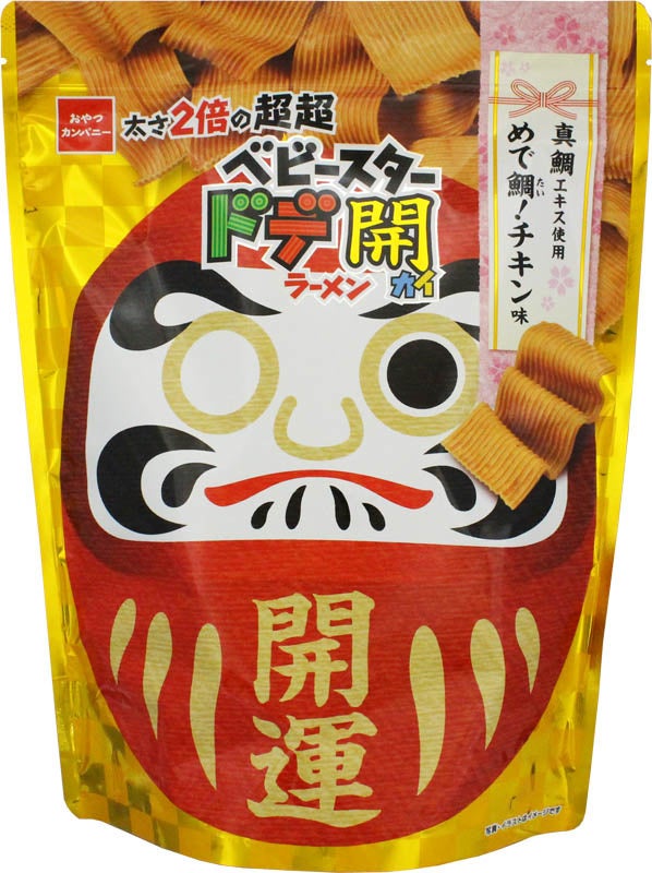 学校や塾の休校、オンラインによる授業など、自宅以外の学習場所が確保しづらい環境下に戸惑いながらも努力を重ねてきた受験生たち。そんながんばる受験生に向けて、噛むことでストレスを発散して気分転換につなげる食べ応えバツグンな「超超ベビースタードデ開ラーメン(めで鯛!チキン味)」を発売します。つまみやすく食べやすい幅広麺のドデカイラーメンの太さを約2倍にすることで、バリバリッとした噛み応えと、ザクザクッとした食べ応えのある商品に仕上げました。味は、真鯛エキスを使用し、噛むほどに真鯛の旨みが口の中に広がる香ばしいチキン味に仕上げています。また、「だるま」や願い事を書き込める「絵馬」が大きく描かれた縁起の良いパッケージで、受験生はもちろん、何かにチャレンジする人の背中を押す願掛けスナック菓子になりました。