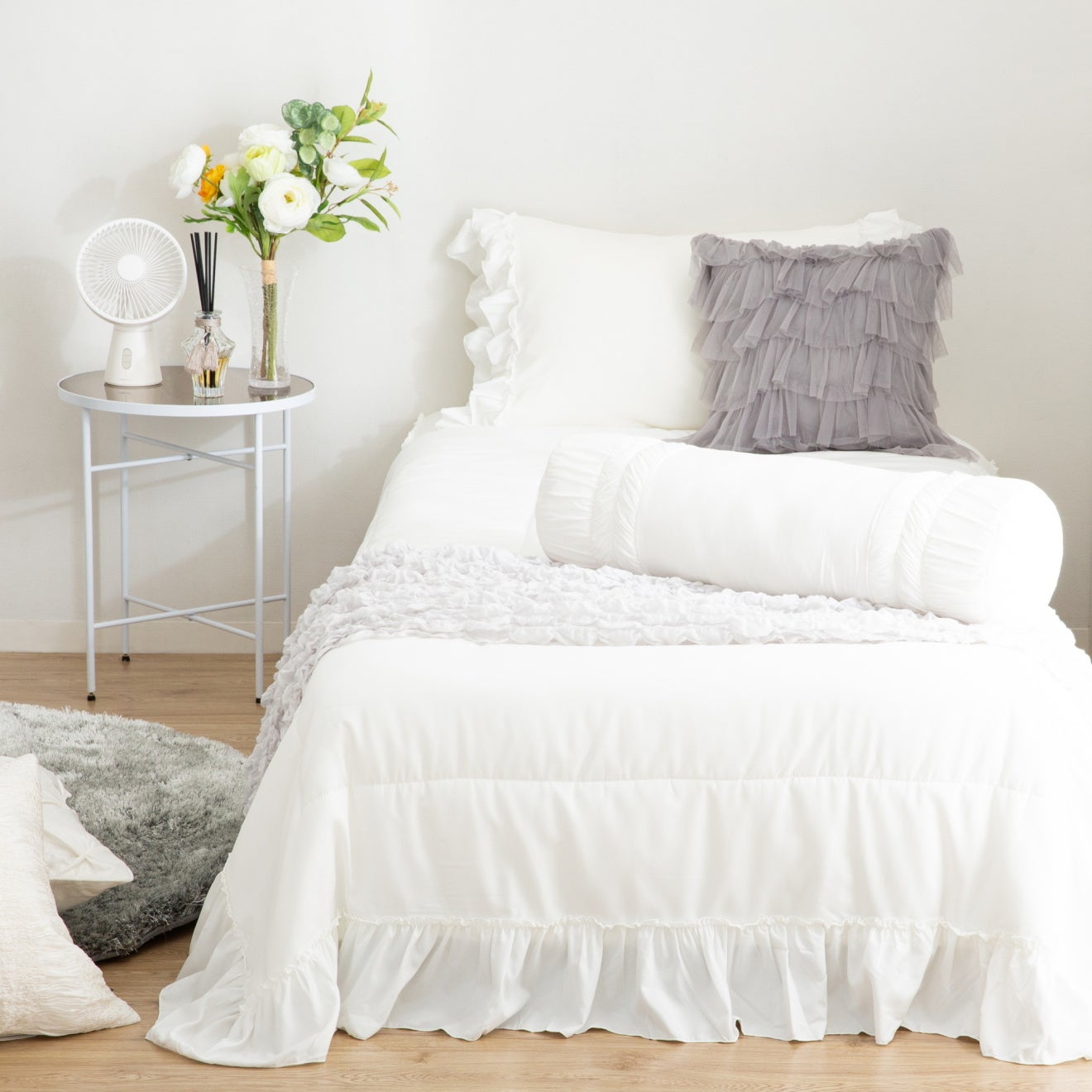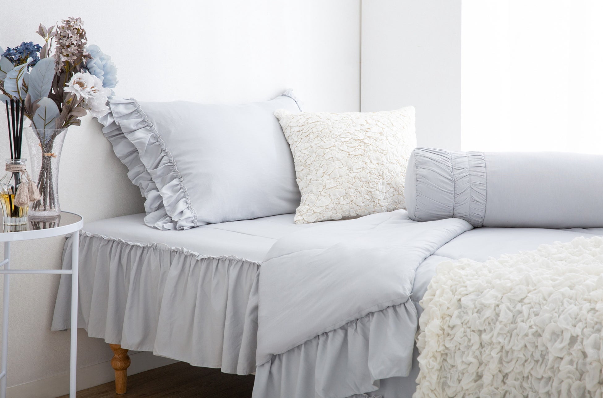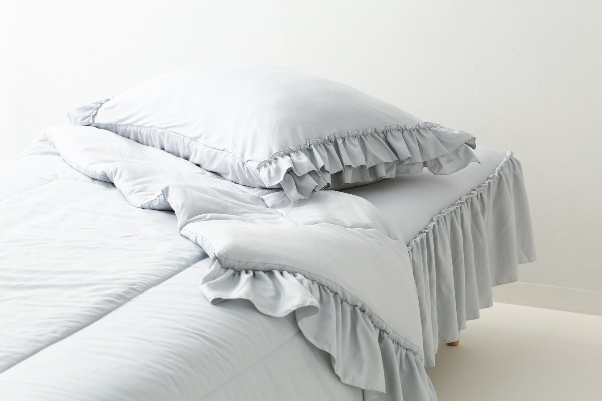 周囲に華やかなフリルを施した、フェミニンな印象を演出してくれるシリーズです。コーディネートに取り入れやすい無地でシンプルなデザインです。フリルを引き立てる落ち感のある生地を使用し、肌に触れる裏地には自然なひんやり感のあるレーヨン素材を使用しているので気持ちの良い肌触りが楽しめます。マットレスもフリルでしっかりカバーできるのが嬉しいポイントです。