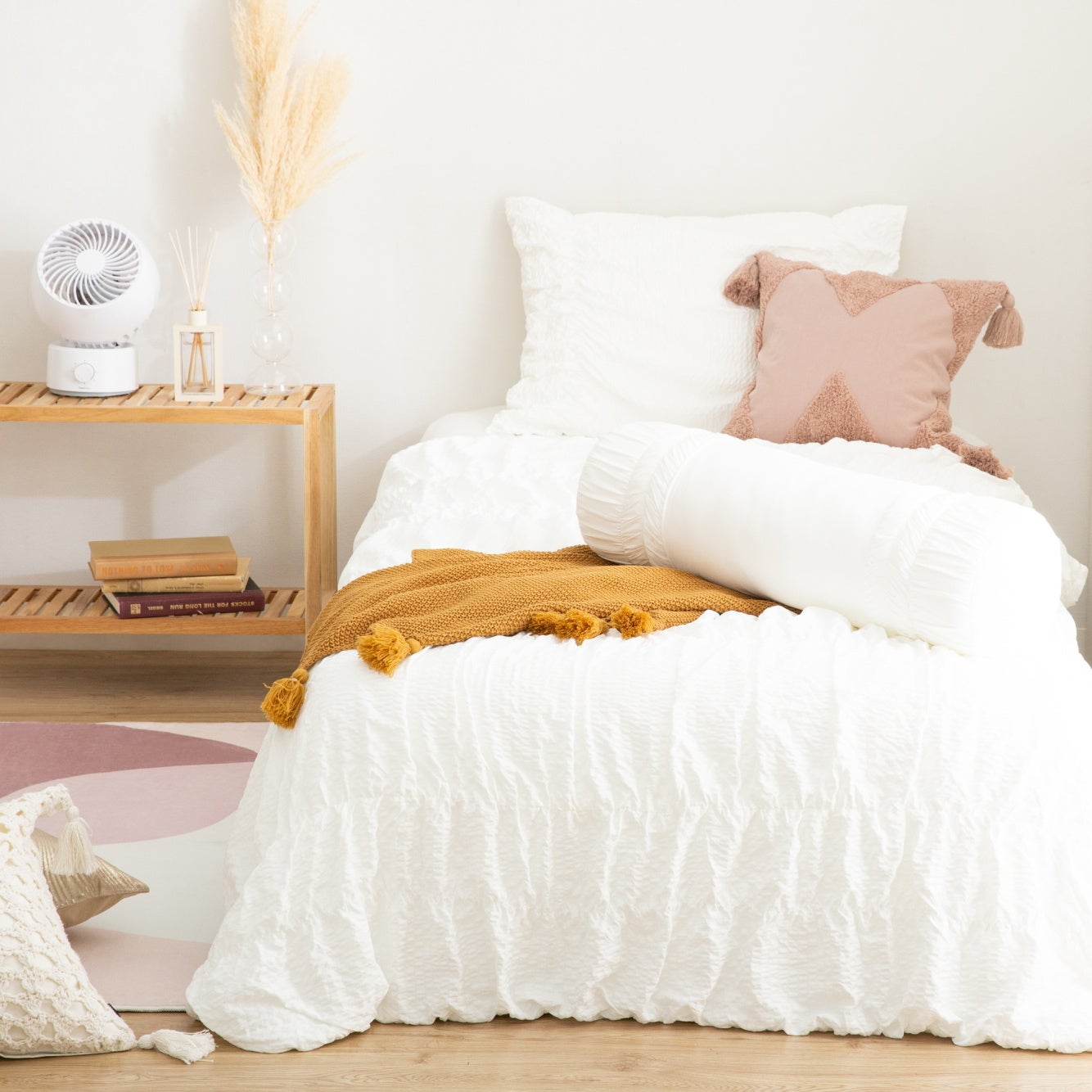 リップル加工を施した生地を使用したシャリ感のあるギャザーが涼やかで爽やかなデザインのシリーズです。肌に触れる裏地には自然なひんやり感のあるレーヨン素材を使用しているので気持ちの良い肌触りを楽しめます。2022年モデルは、マットレスをしっかり隠せるベッドパッドと、全面に施されたギャザーで華やかになったまくらカバーで、より素敵なベッドメイクをお楽しみいただけます。