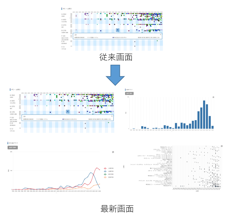 そこで、IPLではこれまでの特許マップに加え、バブルチャート、棒グラフ、折れ線グラフが追加。情報を可視化させるオプションを増やすことで、より直感的に技術トレンドを把握できるように大幅な改良をおこないました。