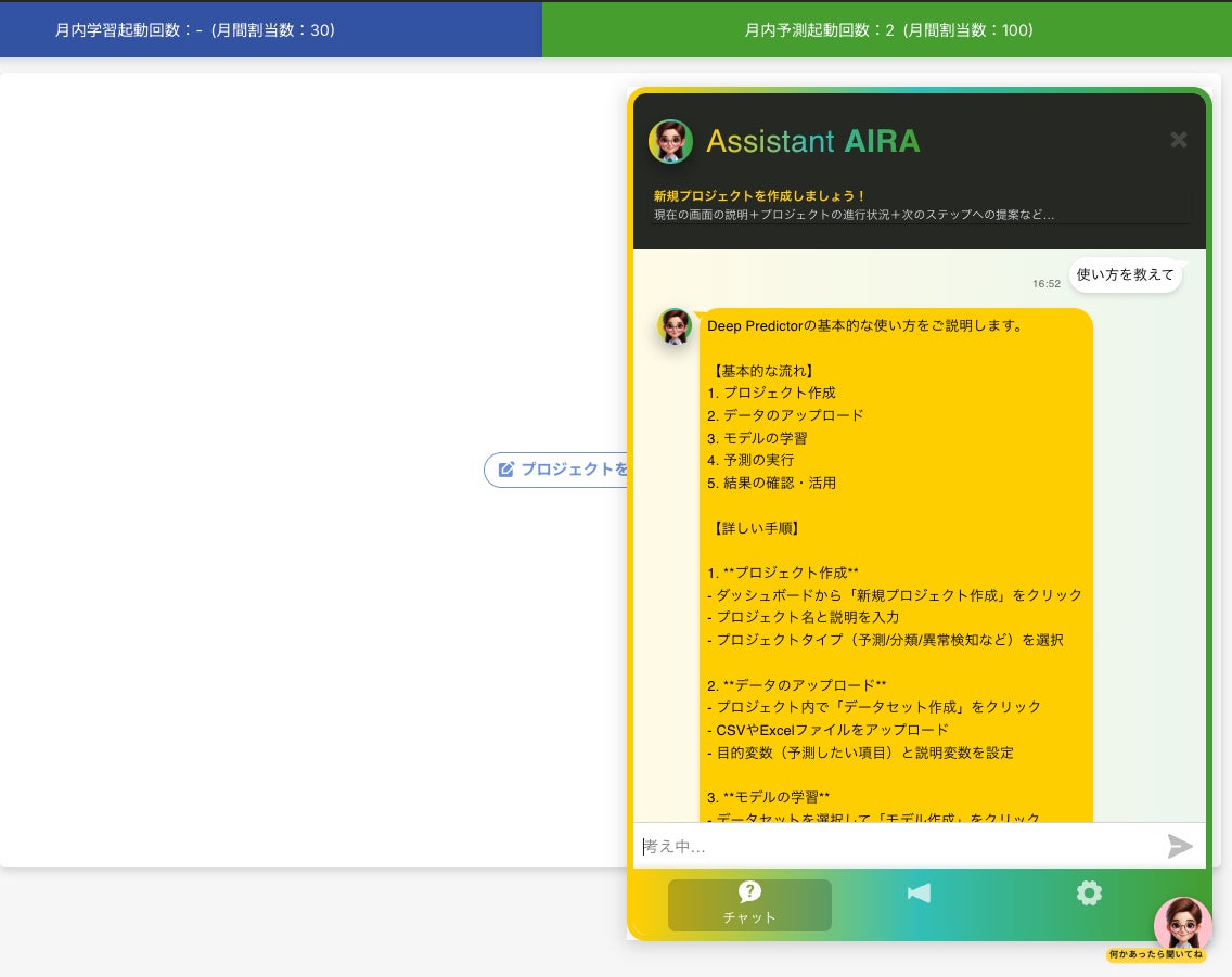 この「Deep Predictor」に新たに搭載した「AIRA(アイラ)」は、操作に必要な情報や手順をチャット形式でご案内するAIエージェントです。ノーコードで使える「Deep Predictor」の使いやすさをさらに向上させ、『対話しながら進めるAI活用』という新しい体験を提供します。