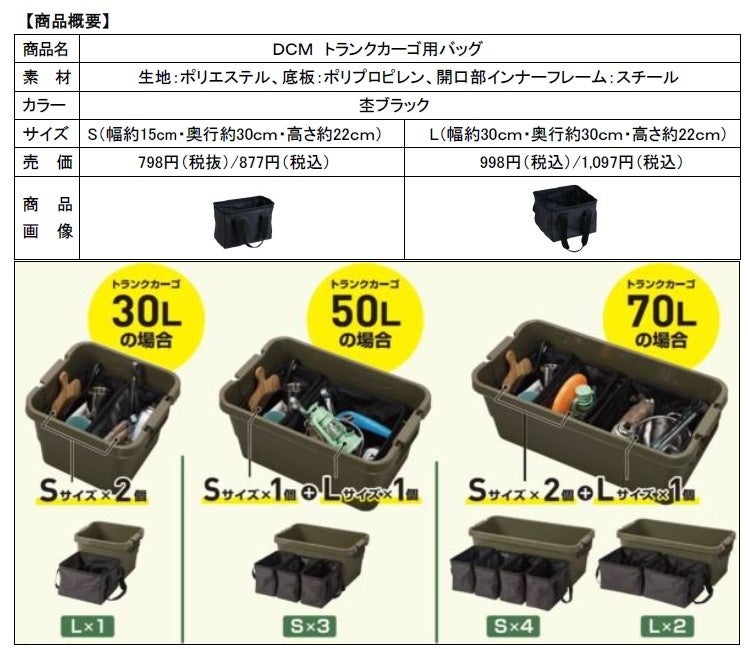 コロナ禍がきっかけとなり、アウトドアやDIYの人気が高まるとともに、使用する道具等を収納運搬する際にコンテナボックスが重宝されています。DCMでは、便利なコンテナボックスとして「DCM トランクカーゴ」を2019年12月より販売し、収納力の高さや丈夫さでご好評をいただいております。DCM トランクカーゴをご利用いただいているお客さまからの、必要なものを取り出し易くして欲しい、収納力をもっとアップしたい、収納物を小分けして簡単に持ち運べるようにして欲しいといった声を反映し、DCM トランクカーゴのインナーケースとして、「DCM トランクカーゴ用バッグ」を発売します。DCM トランクカーゴの各サイズに合わせ、バッグを選択し収納することが可能で、収納力や利便性がアップします。