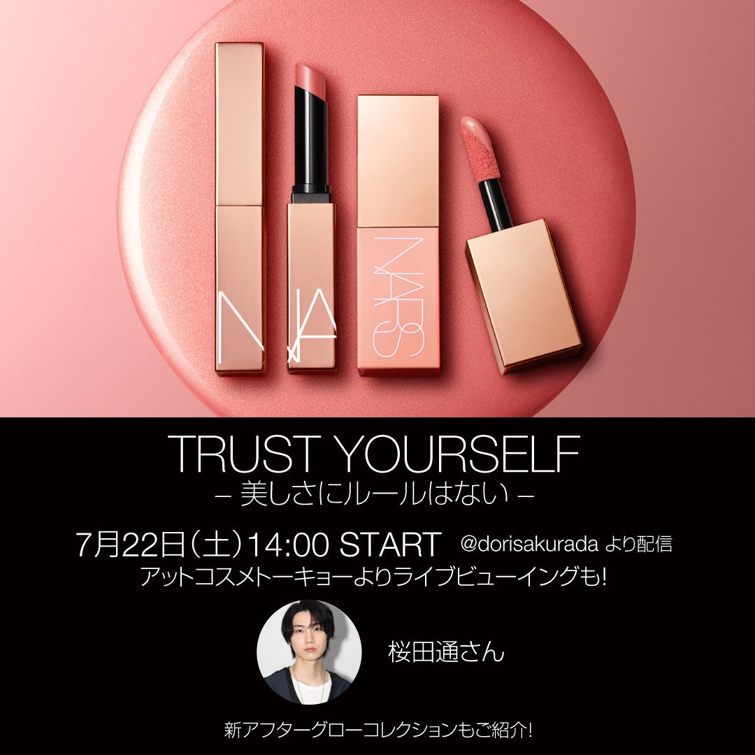 「NARS POPUP STORE」が@cosme TOKYOに期間限定オープンいたします。それを記念して、7月22日(土)14時より、桜田通さんによる、インスタライブを@cosme TOKYOよりライブビューイングで開催いたします。NARS史上最もSWEETな 「アフターグローコレクション」を実際に試しながら魅力や使い方、ブランドメッセージ”TRUST YOURSELF”についてなどを配信予定です。会場では、全国発売に先駆けて、「アフターグロー センシュアルシャイン リップスティック」と「アフターグロー リキッドブラッシュ」をお試し、ご購入いただけます。