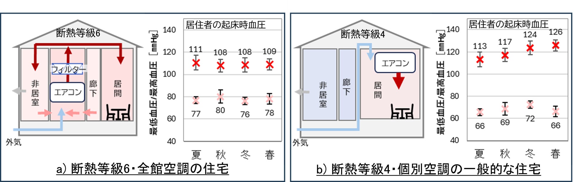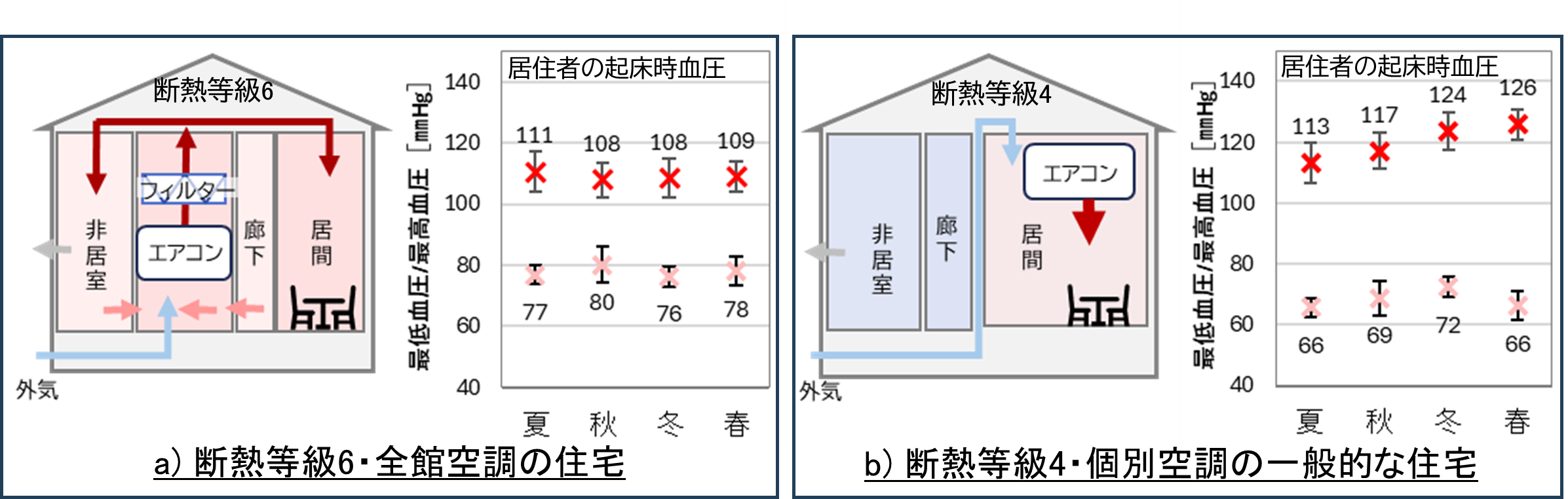 本研究では、断熱性能や空調方式の異なる4世帯(計8名)を対象に、2024年7月から2025年6月までの1年間、室温・湿度、血圧、体表面温度などを測定し、季節変動や起床時の血圧変化との関連を調査しました。その結果、部屋ごとに空調する一般的な住宅では、秋季や冬季に室温が18℃を下回る時間帯があり、血圧が上昇するケースが見られました。一方、全館空調を備えた高断熱住宅では室温が安定し、血圧の季節変動が小さい傾向が確認されました。また、冬によく観察される起床時の血圧上昇は、寝床内と室内の温度差が大きいことで、起床時に体表面の温度が急激に下がることと関係しており、寝床内温度と室温の差が小さい住宅では、朝の血圧変動を抑えられる可能性が示唆されました。