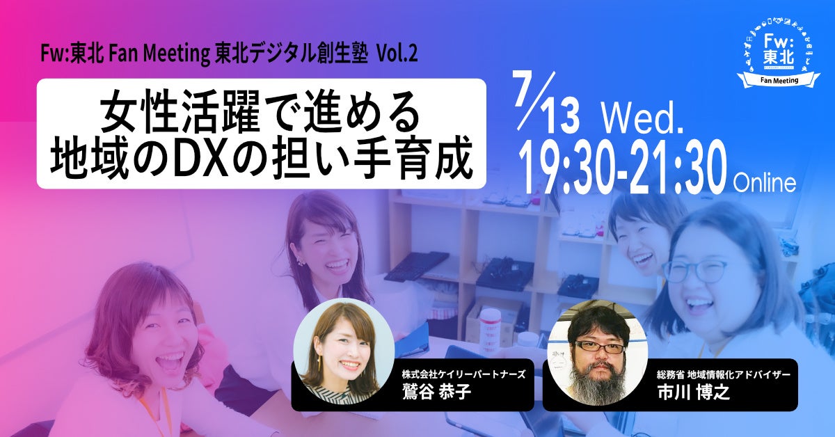 Fw:東北Fan Meetingでは、岩手・宮城・福島の3県で地域課題の解決に取り組む人々と、首都圏および全国の人々をつなぎ、東日本大震災の被災地の復興・創生の好事例となる知見の共有や、地域間の交流および持続的な関係構築を生むためのワークショップを、前身となる「Fw:東北 Weekly」から継続して行ってきました。今回のワークショップのテーマは、女性活躍で進める地域のDXの担い手育成です。
