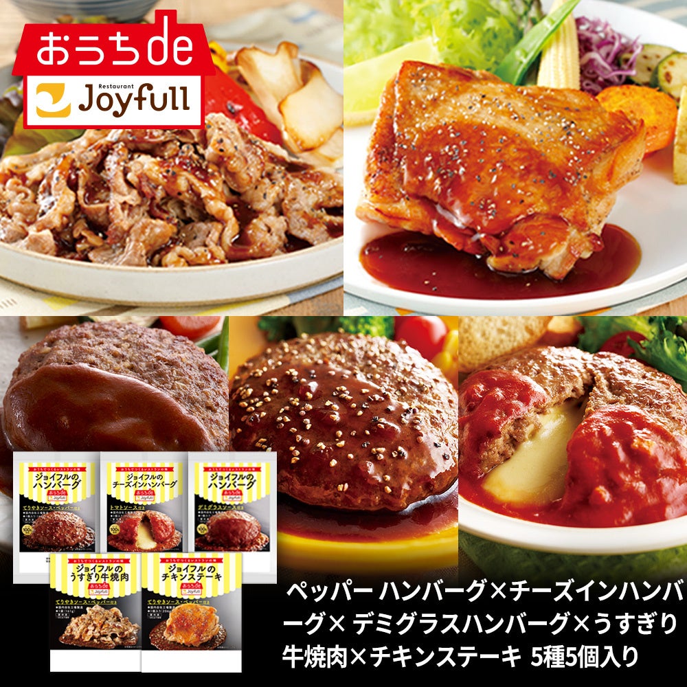 ジョイフルのハンバーグ(てりやきソースペッパー付)×1個、ジョイフルのチーズインハンバーグ(トマトソース付)×1個、ジョイフルのハンバーグ(デミグラスソース付)×1個、ジョイフルのうすぎり牛焼肉(てりやきソースペッパー付)×1袋、ジョイフルのチキンステーキ(てりやきソースペッパー付)×1個