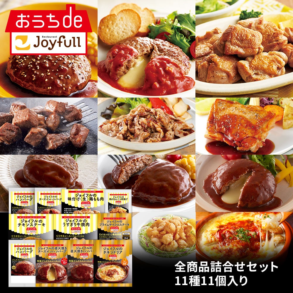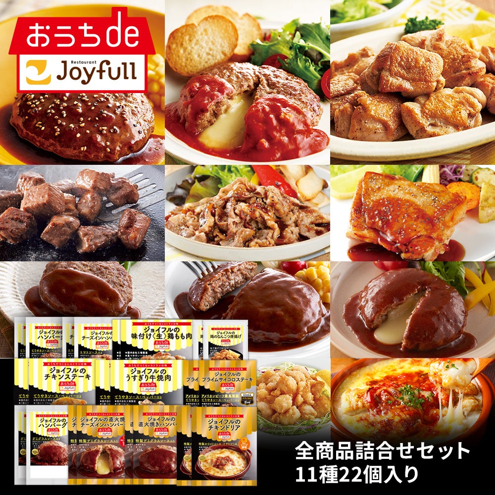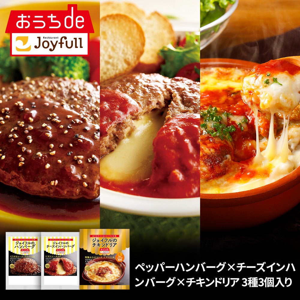 ジョイフルのハンバーグ(てりやきソースペッパー付)×1個、ジョイフルのチーズインハンバーグ(トマトソース付)×1個、ジョイフルのハンバーグ(デミグラスソース付)×1個、ジョイフルのうすぎり牛焼肉(てりやきソースペッパー付)×1袋、ジョイフルのチキンステーキ(てりやきソースペッパー付)×1個、ジョイフルの味つけ〈生〉鶏もも肉×1袋、ジョイフルの直火焼きハンバーグ(デミグラスソース入)×1個、ジョイフルの直火焼きチーズインハンバーグ(デミグラスソース入)×1個、ジョイフルのチキンドリア×1個、ジョイフルのプライムサイコロステーキ(てりやきソースペッパー付)×1袋、ジョイフルの鶏のなんこつ唐揚げ×1袋