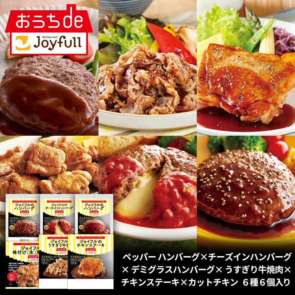 ジョイフルのハンバーグ(てりやきソースペッパー付)×1個、ジョイフルのチーズインハンバーグ(トマトソース付)×1個、ジョイフルのハンバーグ(デミグラスソース付)×1個、ジョイフルのうすぎり牛焼肉(てりやきソースペッパー付)×1袋、ジョイフルのチキンステーキ(てりやきソースペッパー付)×1個、ジョイフルの味つけ〈生〉鶏もも肉×1袋
