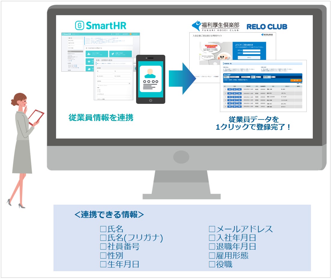 「福利厚生倶楽部」では、かねてより「SmartHR」とデータ連携し、「SmartHR」内に蓄積された従業員データを、安全かつ正確に取り扱える上に、手間なく「福利厚生倶楽部」の会員データベースへ連携することを可能としています。