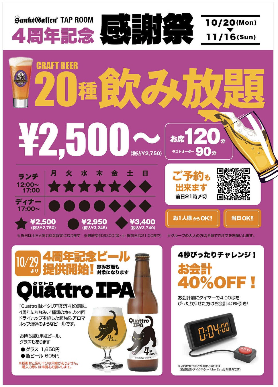 サンクトガーレン タップルーム4周年記念ビール「Quattro IPA」を10月29日発売 感謝祭で20種の樽生が2,750円〜飲み放題(11月16日まで)