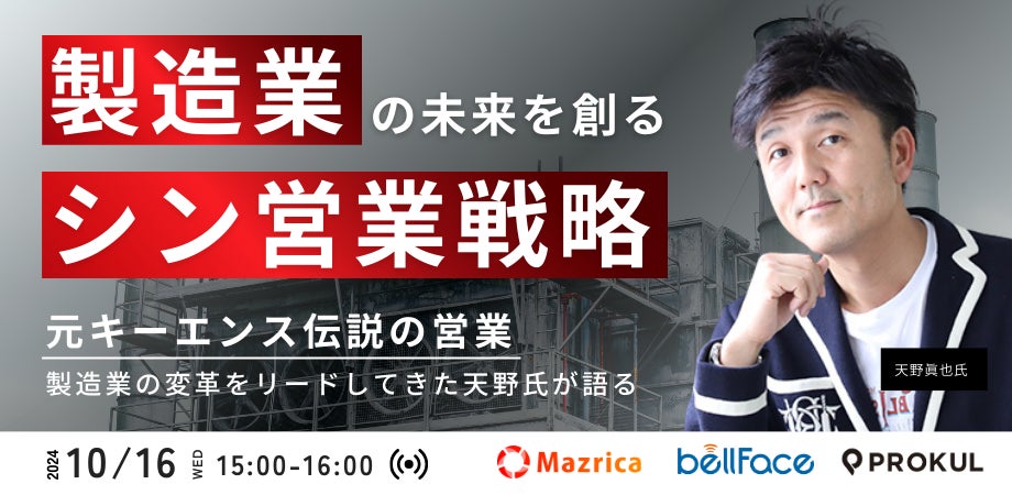 株式会社エンファクトリー(東京都千代田区、代表取締役社長CEO加藤健太)は、株式会社マツリカ(東京都中央区、代表取締役CEO 黒佐英司)、ベルフェイス株式会社(東京都港区、代表取締役中島一明)とともに、2024年10月16日(水)15:00-16:00に『製造業の未来を創る「シン」営業戦略~元キーエンス伝説の営業 製造業の改革をリードしてきた天野氏が語る~』セミナーを開催します。
