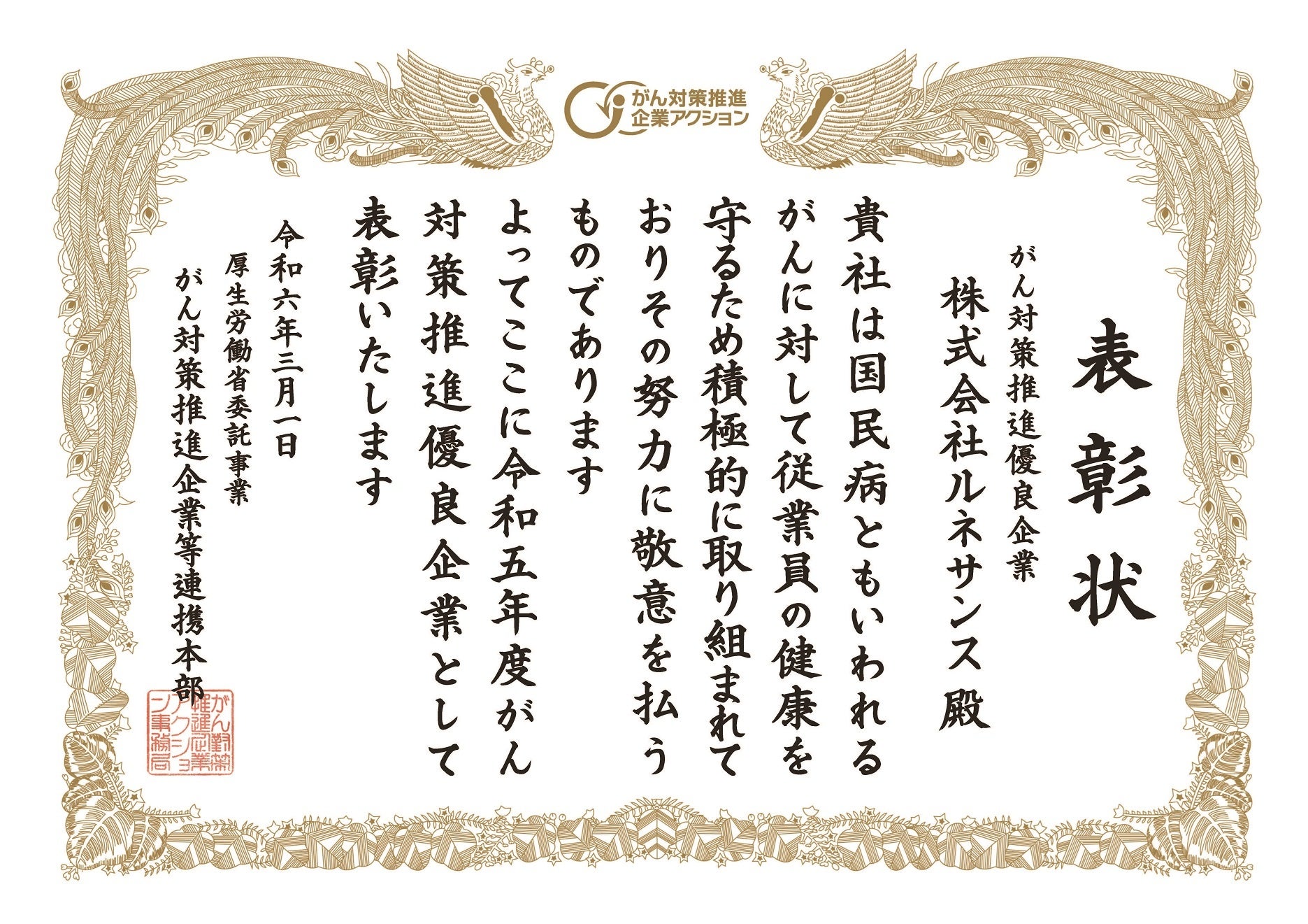 株式会社ルネサンス(代表取締役社長執行役員:岡本 利治、本社:東京都墨田区、以下「当社」)は、厚生労働省が推進する「がん対策推進企業アクション」において、令和5年度「がん対策推進優良企業」として表彰されたことをお知らせいたします。当社は今回が初めての受賞となります。