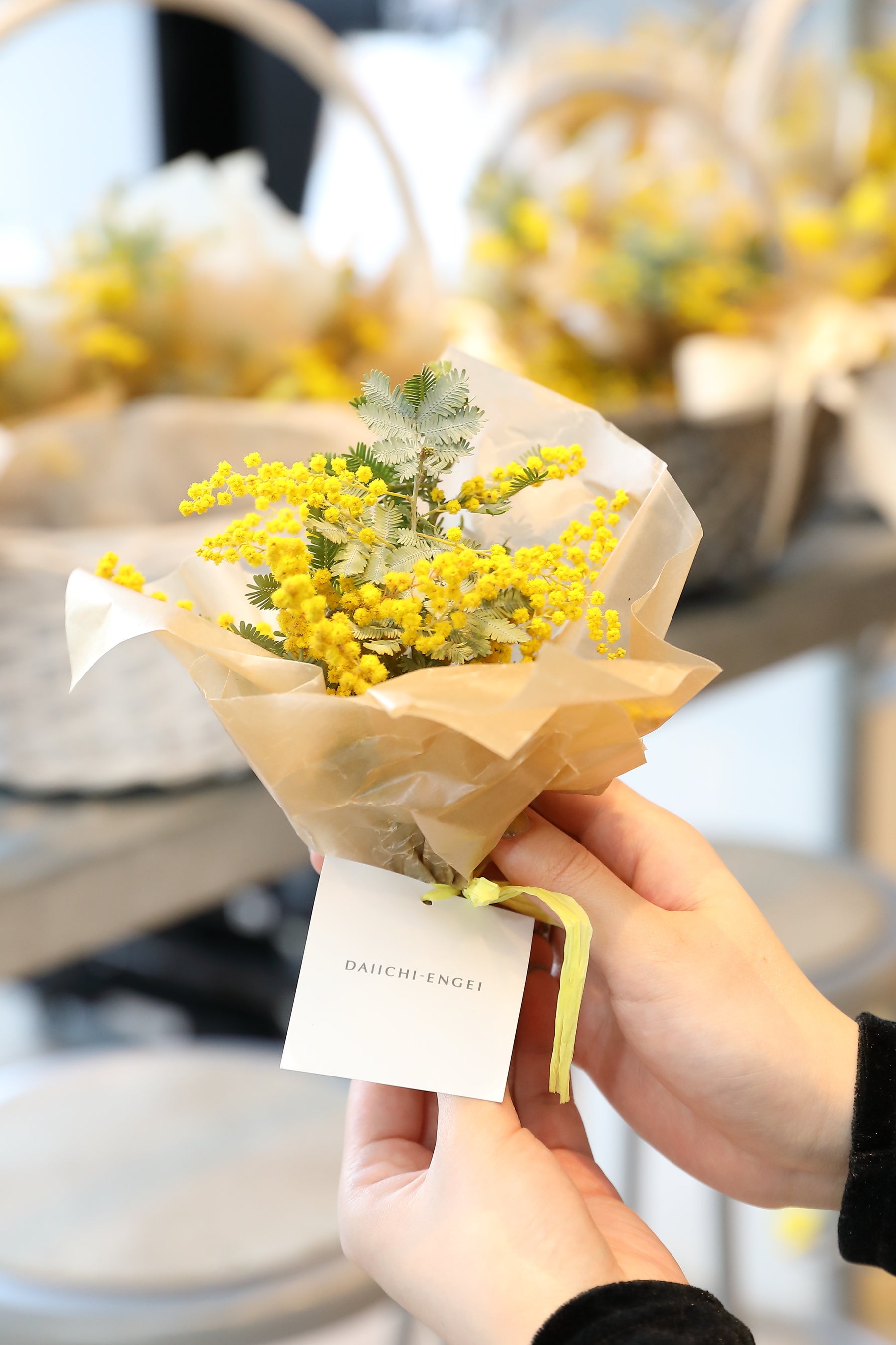 今年の冬は暖かく、ミモザの咲く時期が例年より早まり、綺麗なミモザを準備できるかどうか心配でしたが、仕入れ担当の協力もあり、新たな取り組みの門出にふさわしい素晴らしいミモザを準備することができました。