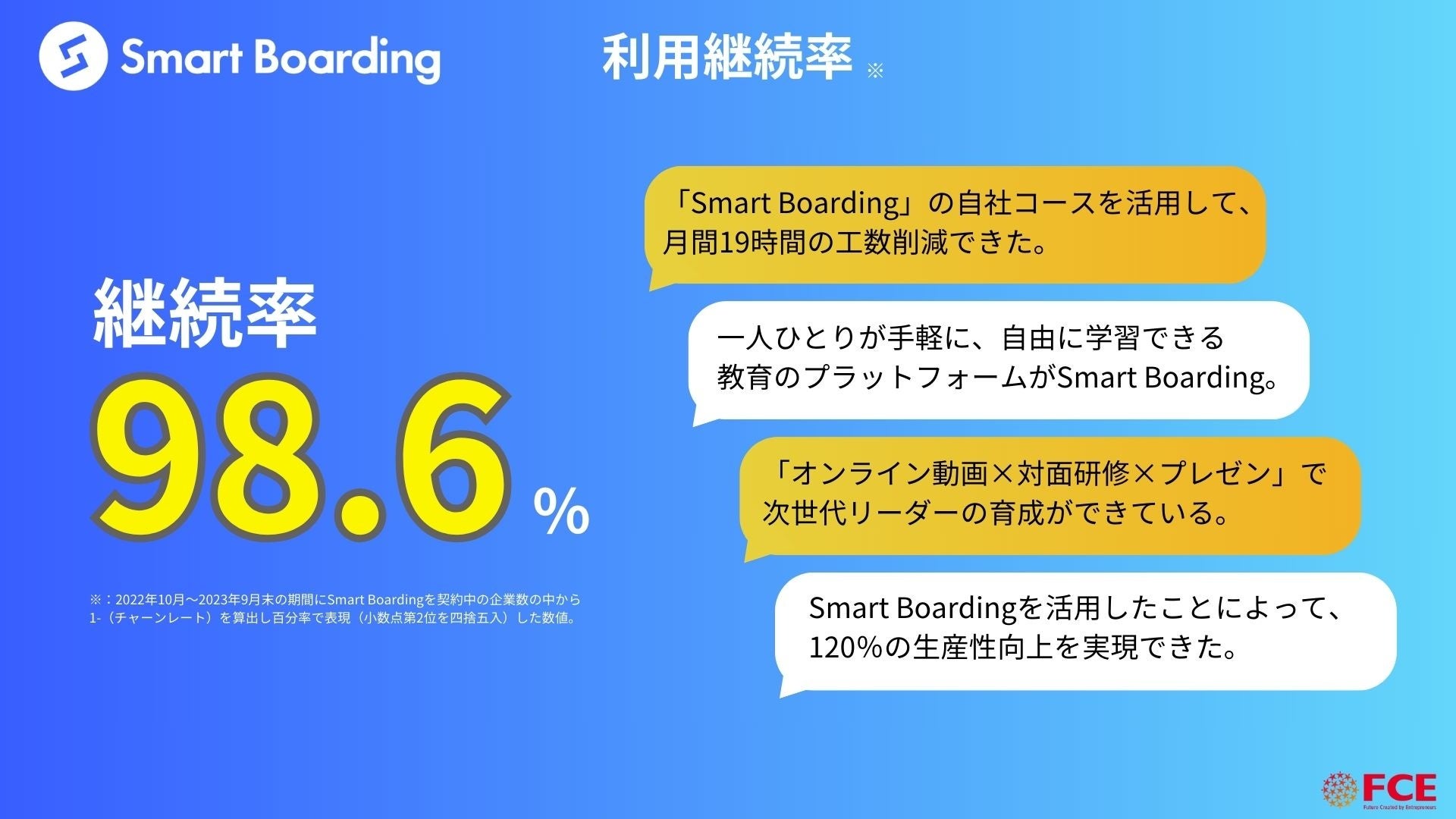 ※2:2022年10月~2023年9月末の期間にSmart Boardingを契約中の企業数の中から1-(チャーンレート)を算出し百分率で表現(小数点第2位を四捨五入)した数値。| ※1※2いずれも株式会社FCEトレーニング・カンパニー事業本部の調査による。