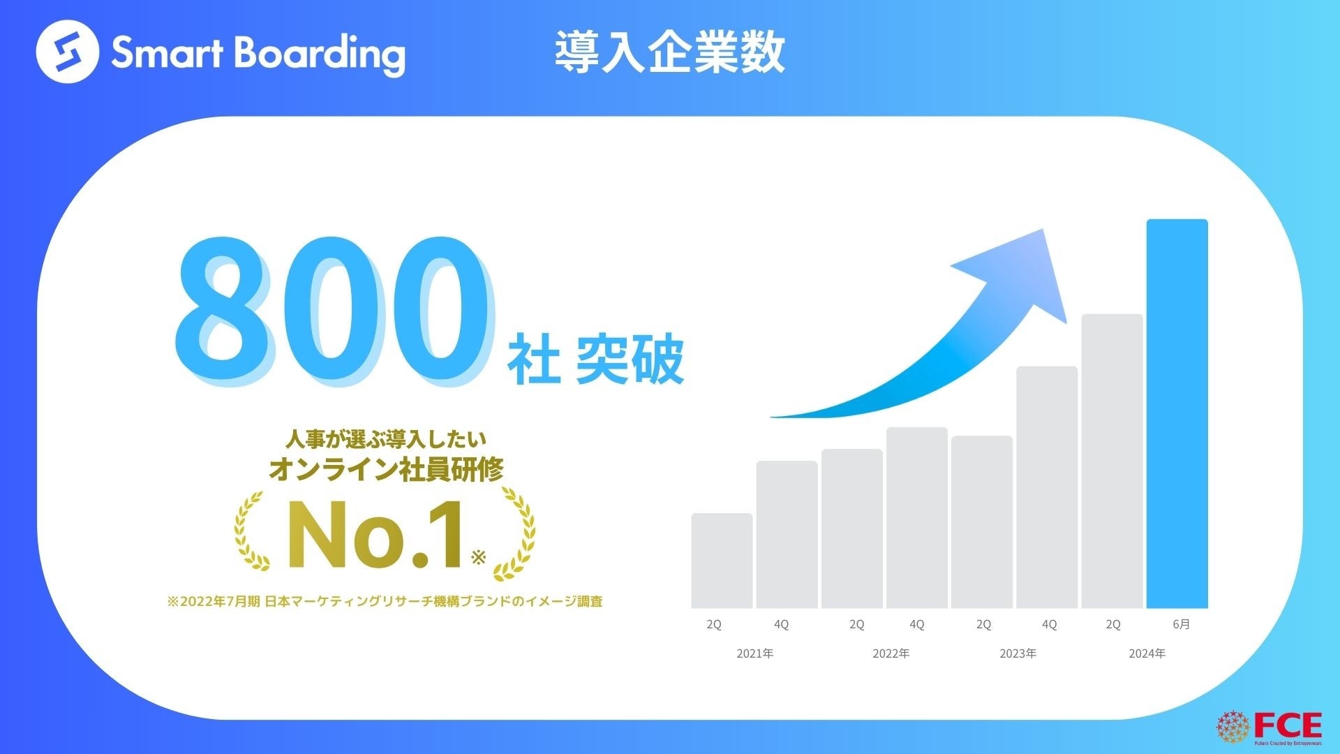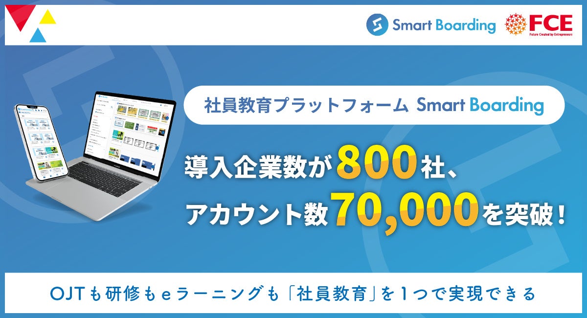 株式会社FCE(本社:東京都新宿区、代表取締役:石川淳悦、東証9564)が提供する、社員教育プラットフォーム「Smart Boarding」(スマートボーディング)(https://www.smartboarding.net/)は、2024年6月末をもって導入企業数が800社、アカウント数が70,000を突破したことをお知らせいたします。