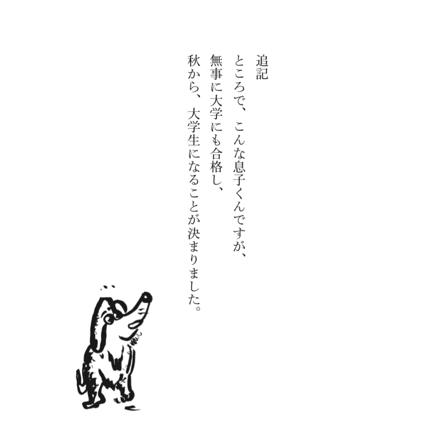 3月某日、息子は低血圧なのだ。朝はほぼ返事がかえってこない。もちろん、いいやつなので、心の中では「おはよう」と言っているに違いないのだけれど......。夕飯時も平日は返事が即座に戻ってくることはない。ご飯を食べている時に、今日はどうだった、と訊くと、うん、と戻ってくるだけ。でも、別に反抗期だからとかそういうことじゃない。単に、疲れているのだろうし、そもそも今話し合わないとならないことがないだけかもしれない。だから、ぼくもそれ以上、訊き返すことをしない。食べ終わると息子は「ごちそうさま」と言って自分の食器を片付け、部屋にこもる。16歳という年齢から考えると普通の行動だ。