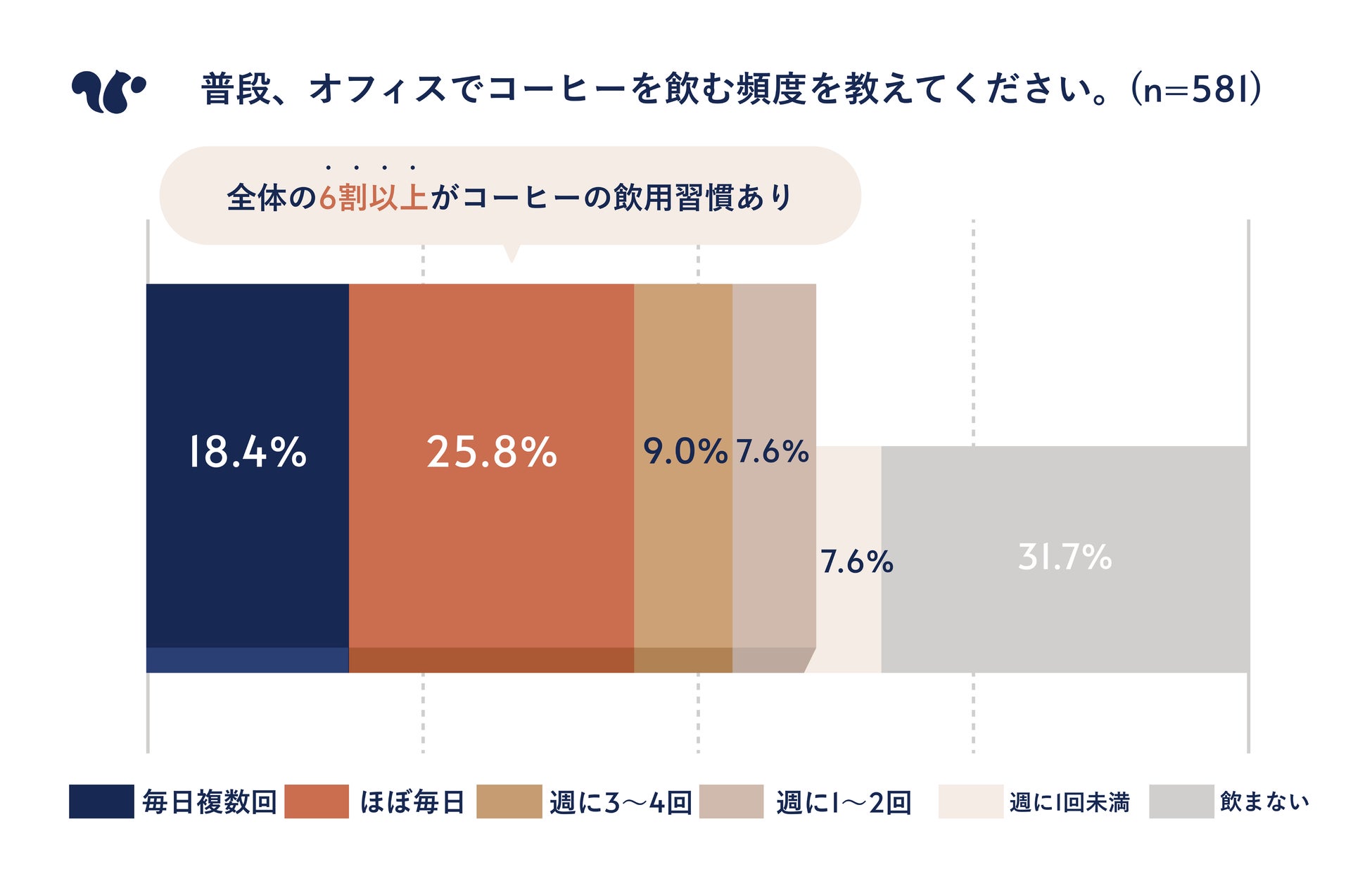「週1以上飲む」と答えた人を含めると6割以上の人がオフィスでコーヒーを飲む習慣があることが明らかになった。