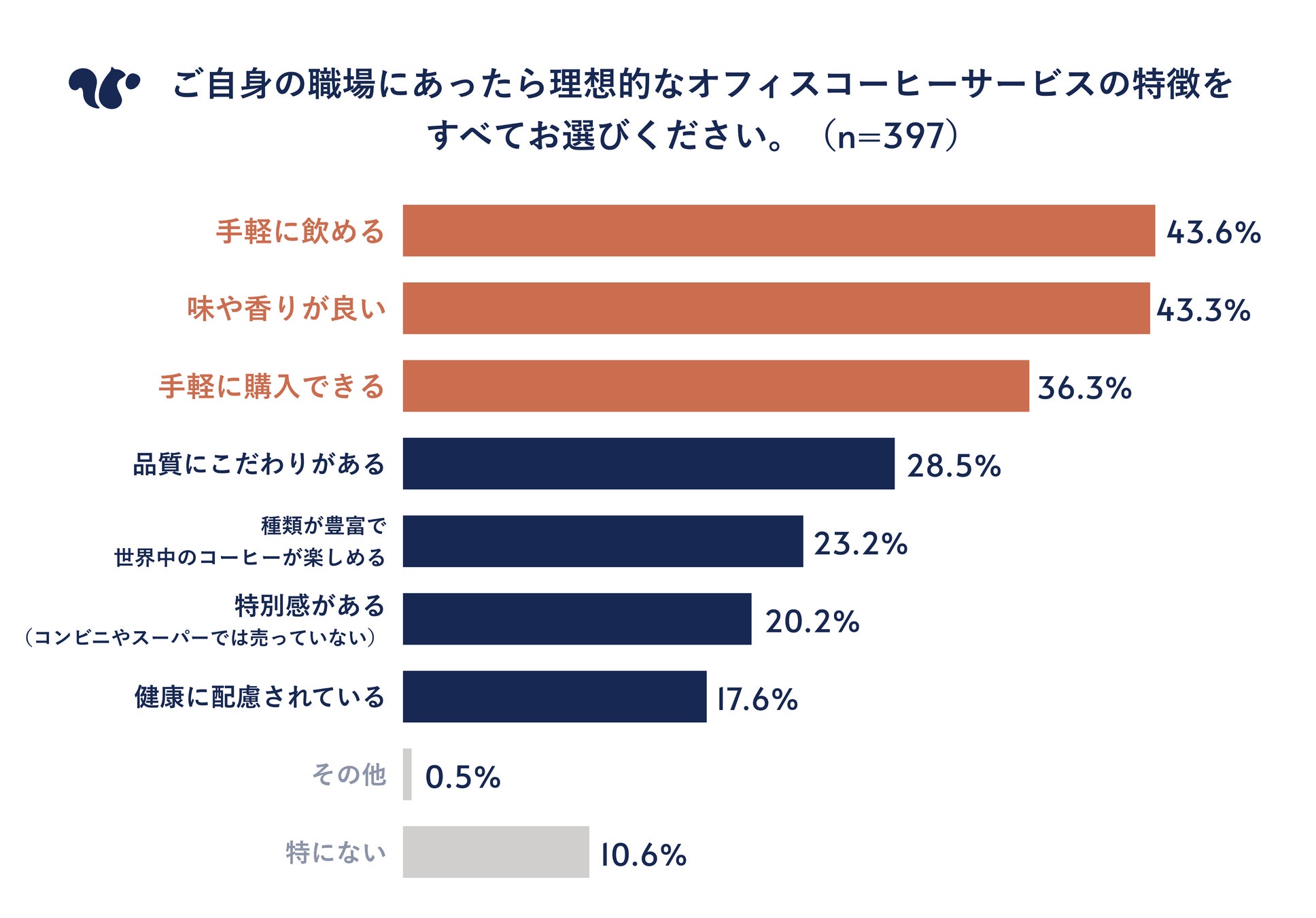 職場にあったら理想的なオフィスコーヒーサービスの特徴を聞いたところ、「手軽に飲める(43.6%)」が首位で、僅差で「味や香りが良い(43.3%)」が次点に。続いて「手軽に購入できる(36.3%)」が多く集まり、飲む・購入する際の手軽さや、コーヒーそのものの品質の2点が重要視されていることがわかった。