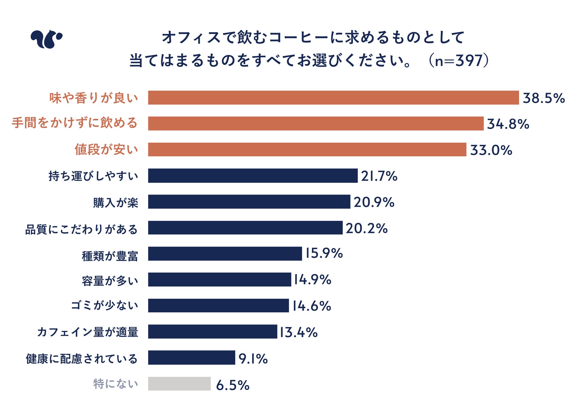 ・オフィスで飲むコーヒーに求めるのは「味や香りが良い」、「手間をかけずに飲める」、「値段が安い」の3つ。