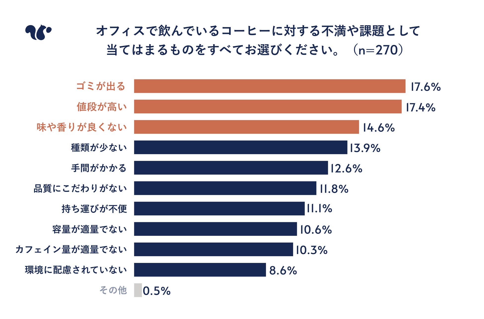 ・現在オフィスで飲んでいるコーヒーに対して「値段が高い」、「ゴミが出てしまう」、「味や香りが良くない」などの不満を感じている人が多い。