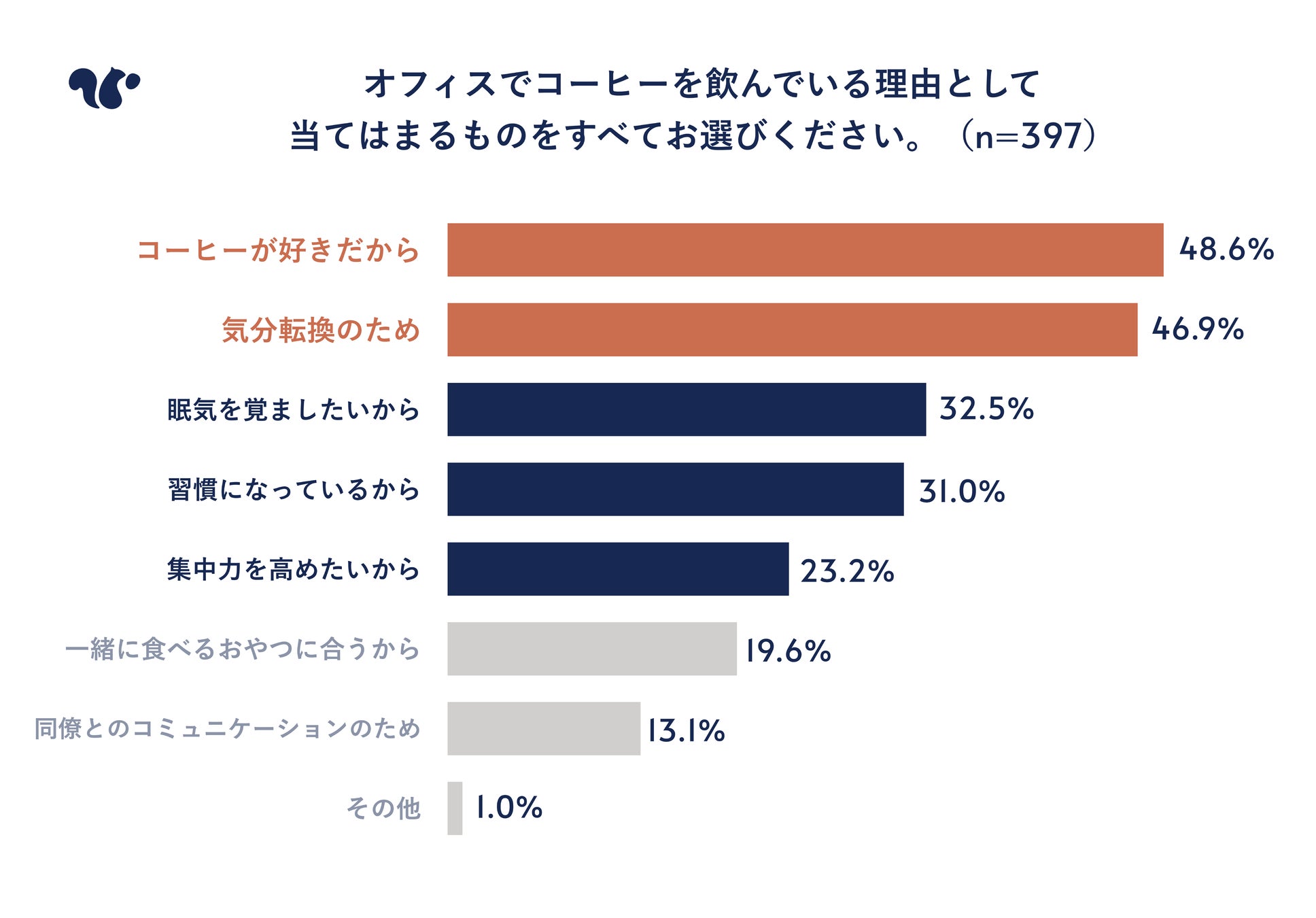 前問で「コーヒーを飲む」と答えた人を対象に、オフィスでコーヒーを飲む理由を聞いたところ、「コーヒーが好きだから(48.6%)」が最上位に。