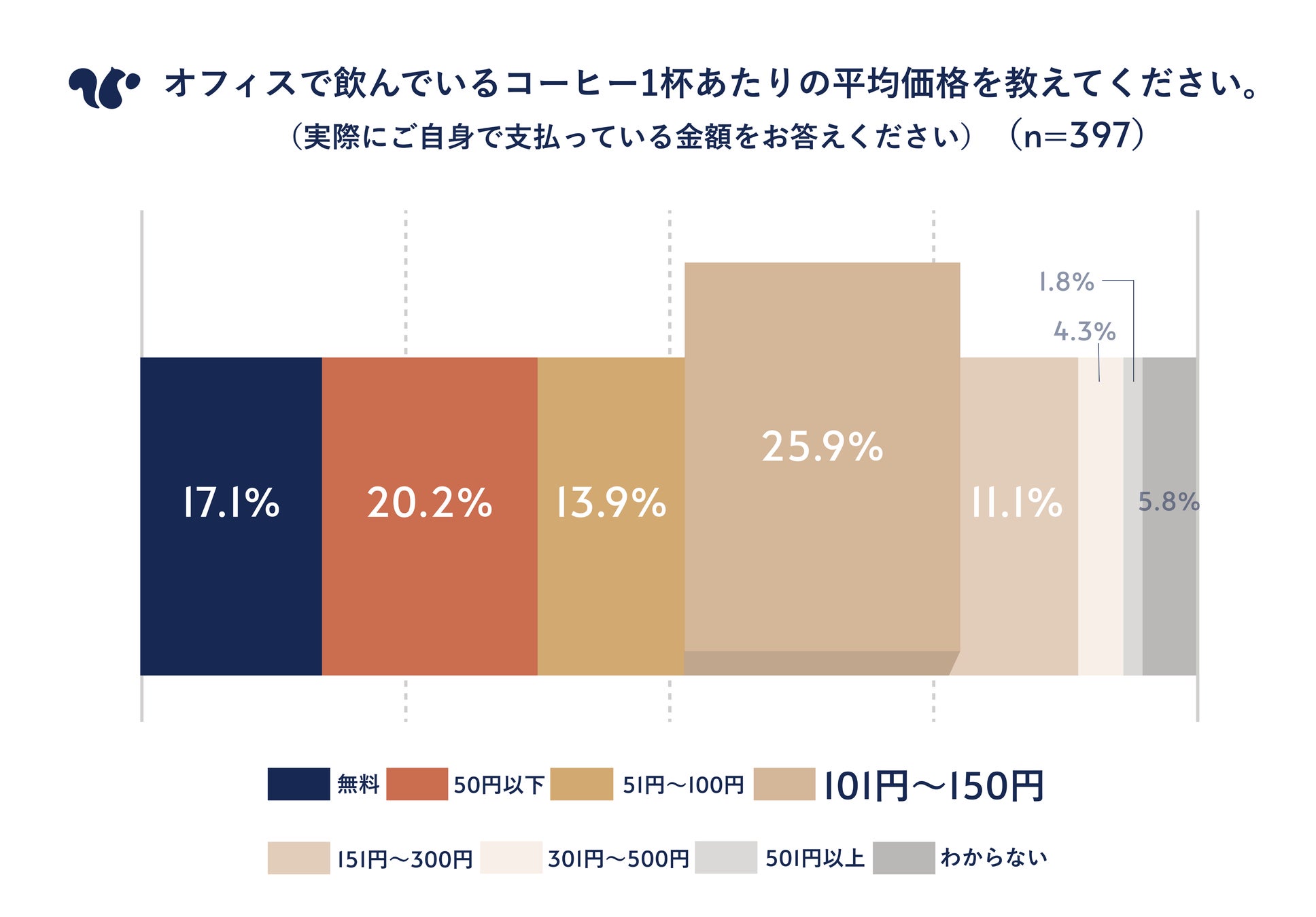 今回の調査でコーヒー1杯飲むために現在支払っている金額を聞いたところ、「101円〜150円(25.9%)」と最多となりました。