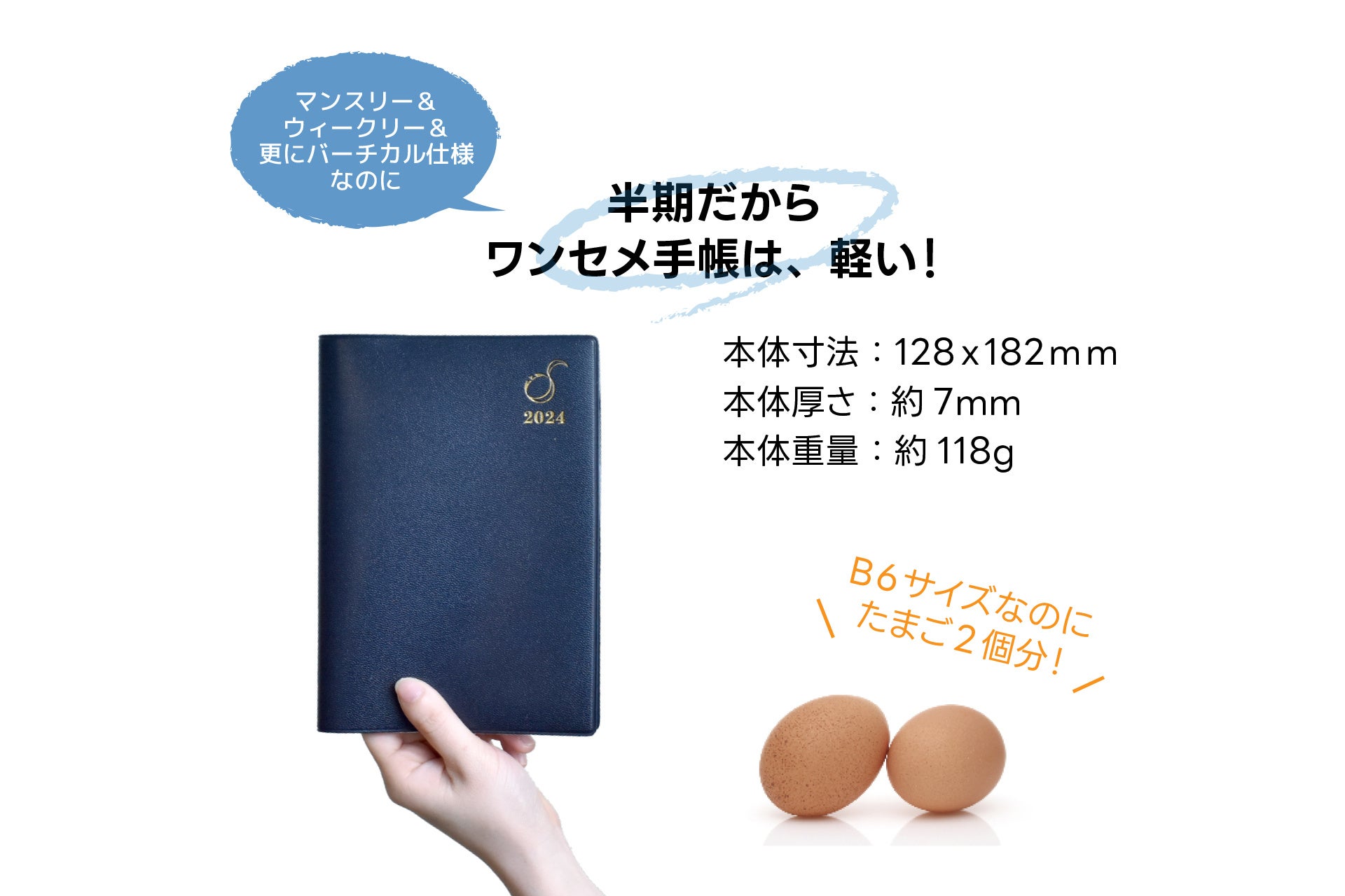 ワンセメ手帳は、前期(3月〜8月)、後期(9月〜3月)の上下に分かれた仕様です。これにより1冊が軽量化、しっかりと予定を書きたいけれど、荷物はコンパクトにしたいと考える層にヒットしました。