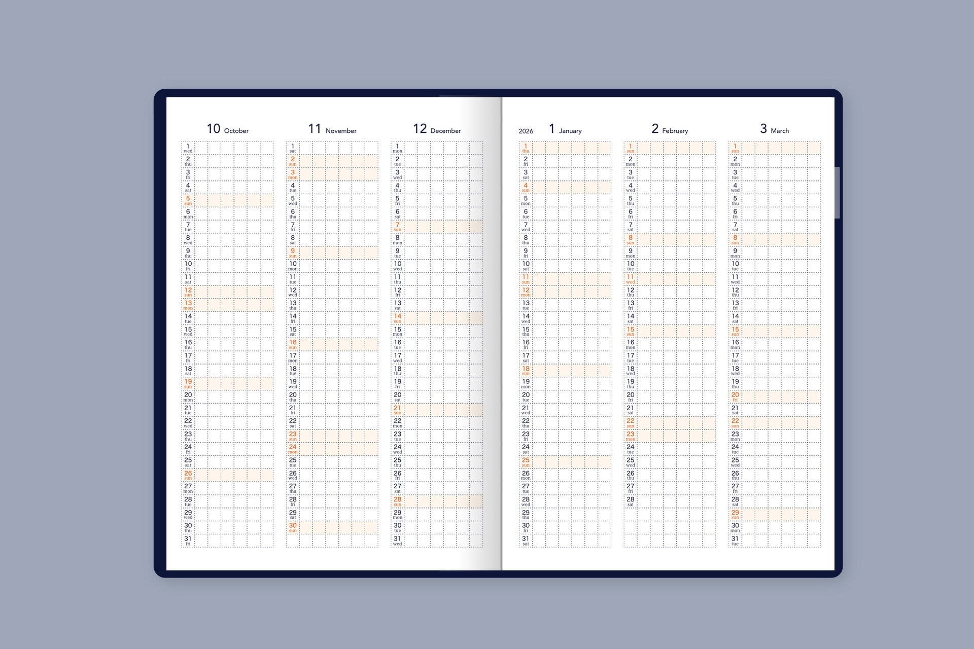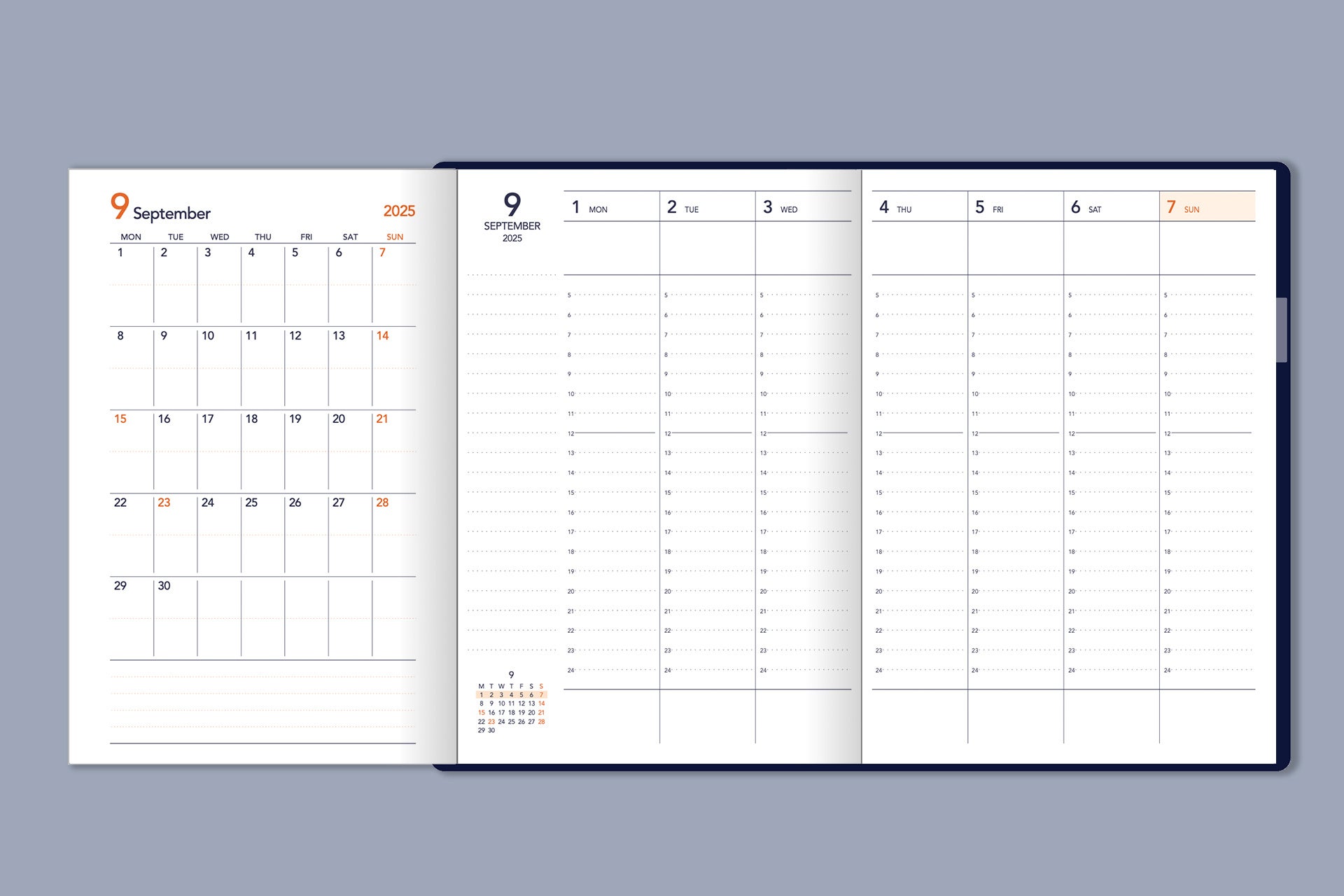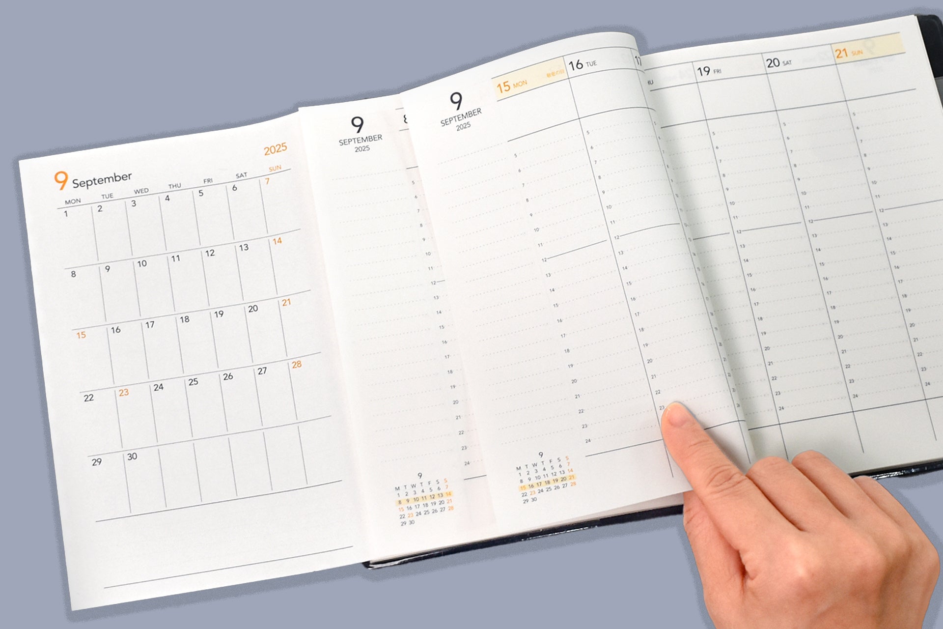 月と週の予定がひとめで見渡せるので、予定管理が素早く間違いなく行えるように。「タイパ」を重視する層だけでなく、タスクの多い社会人、家族の予定を管理する主婦層に絶賛されています。特殊な工程を必要とするため、製本技術に自信のある手帳メーカーだから実現した仕様です。
