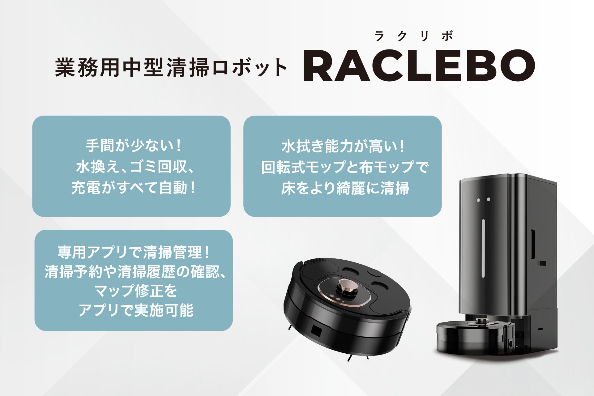 中型清掃ロボット「RACLEBO」は、家庭用ロボットだと清掃が終わらず、大型タイプだとオーバースペックになる広さの店舗や施設でも効率的に清掃でき、導入コストも高くなくおすすめの清掃ロボットです。