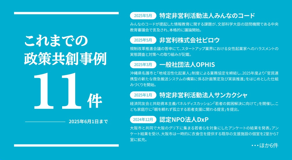 こうした活動を通じて、具体的な政策の芽が着実に育ち始めています。たとえば、こども・若者の貧困分野では自治体との共同事業が国の政策に反映され、医療分野では課題解決に向けたモデル事業が開始しました。さらに、女性活躍分野では提言が国の重点項目として取り上げられるなど、多くの分野で政策共創が実を結んでいます。