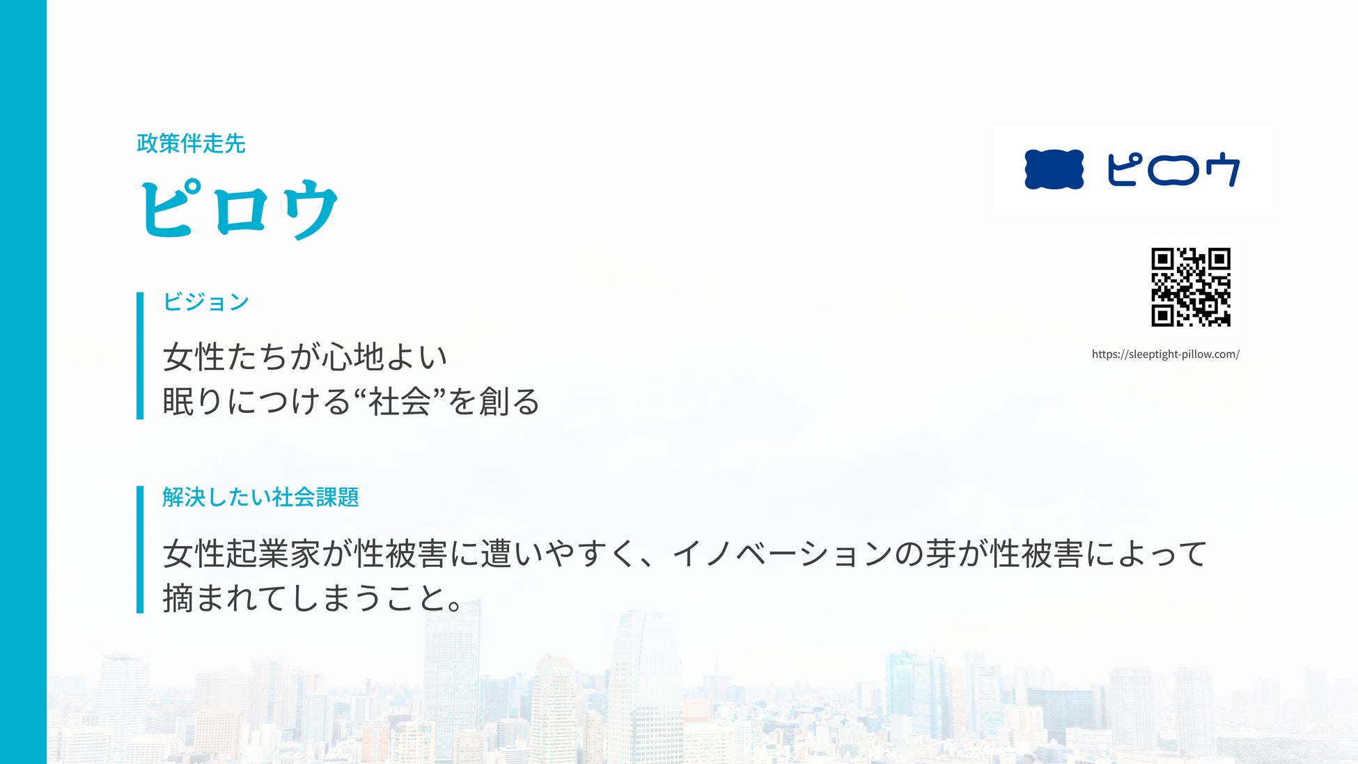私たちは資金提供にとどまらず、政策実現に向けた伴走支援や実証機会の提供も行い、政策共創の文化を社会に根付かせたいと考えています。この度、具体的な提言をまとめた政策提言集を作成いたしました。