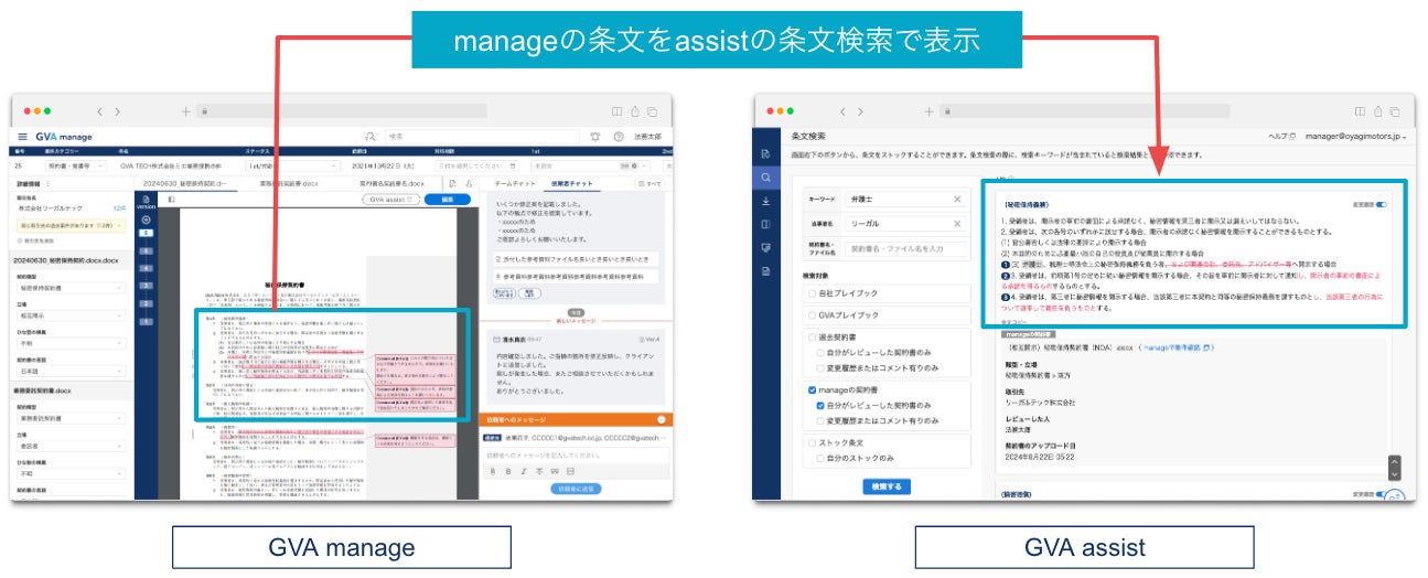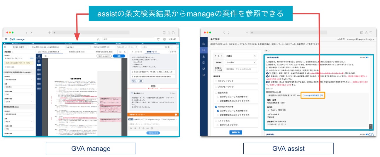 GVA TECH株式会社(本社:東京都渋谷区、代表取締役:山本 俊、以下GVA TECH)は、マターマネジメントシステム「GVA manage」に蓄積された契約書と、AI契約書レビュー支援クラウド「GVA assist」の条文検索機能とを連携したことをお知らせします。今回のアップデートにより、実案件を契約書レビュー時に効率よく活用できるようになりました。