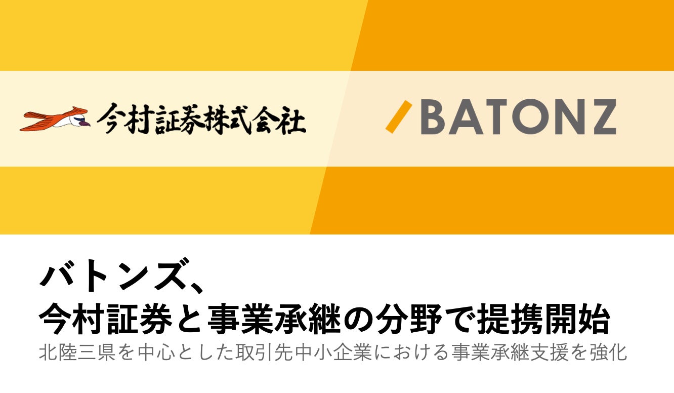 今村証券は、地域で最も信用、信頼される金融機関をめざし中小企業支援に取り組んでおり、マッチング支援の一環として事業承継にも取り組んできました。今回の提携では、後継者のいない中小企業・小規模事業者の第三者承継・M&Aをより推進するため、今村証券とバトンズが連携し、事業承継支援ネットワークを強化します。これにより、北陸三県を中心とした後継者不在企業の事業承継を推進して価値ある事業を次世代へとつなげることで、雇用を守り地域経済の活性化を図ることを目的としています。