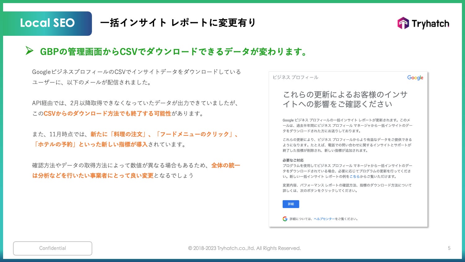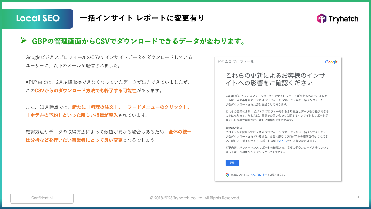 Googleビジネスプロフィールは以前から「ルートの検索数」「電話回数」など、Googleビジネスプロフィール経由で行われた行動データをCSV形式で出力することができましたが、10月からダウンロードできるデータの形式の一部が変更されています。