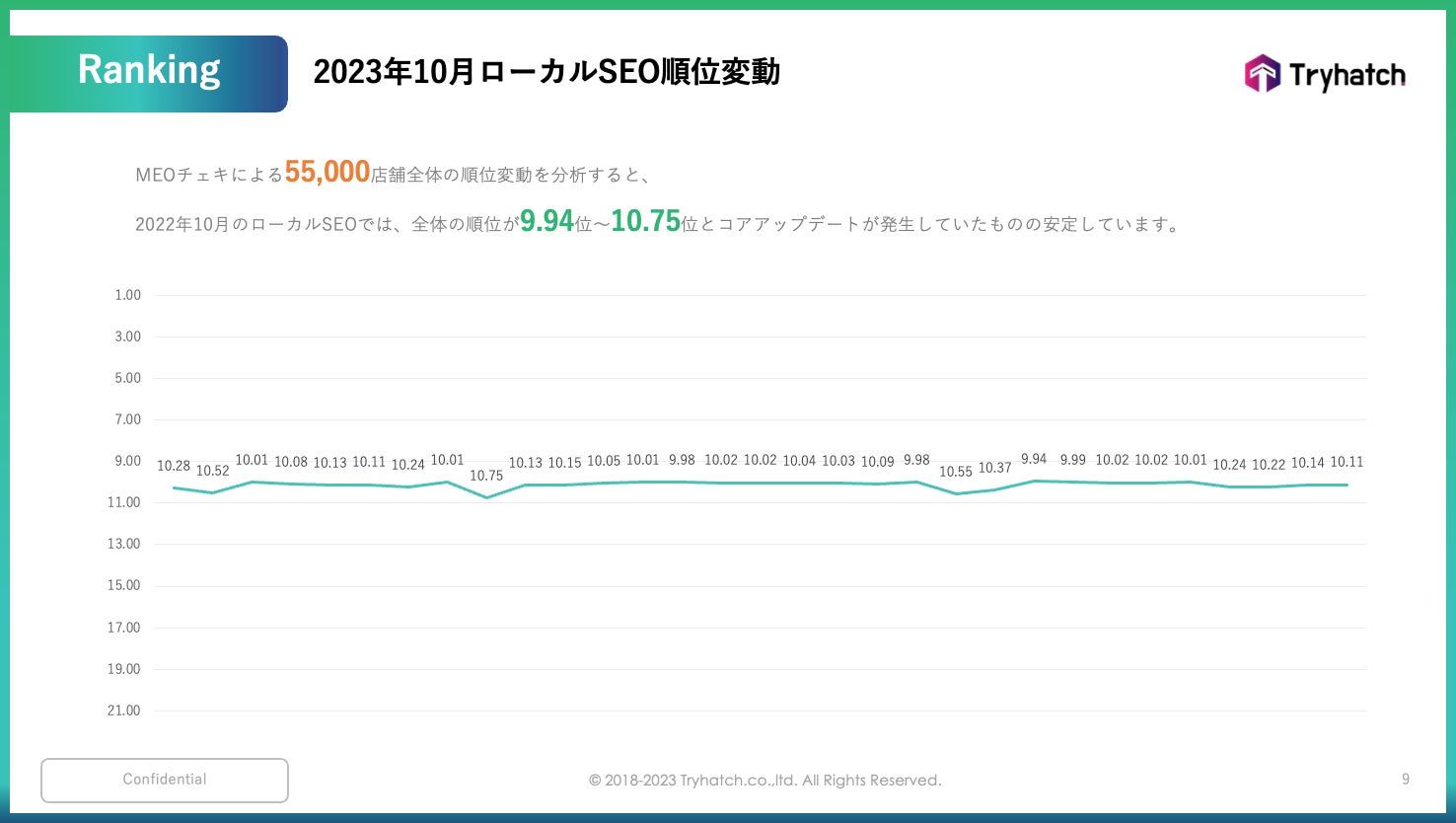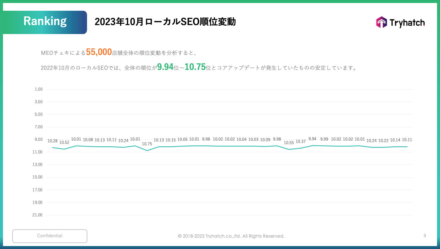 2022年10月のローカルSEOでは、全体の順位が9.94位〜10.75位とコアアップデートが発生していたものの安定しています。