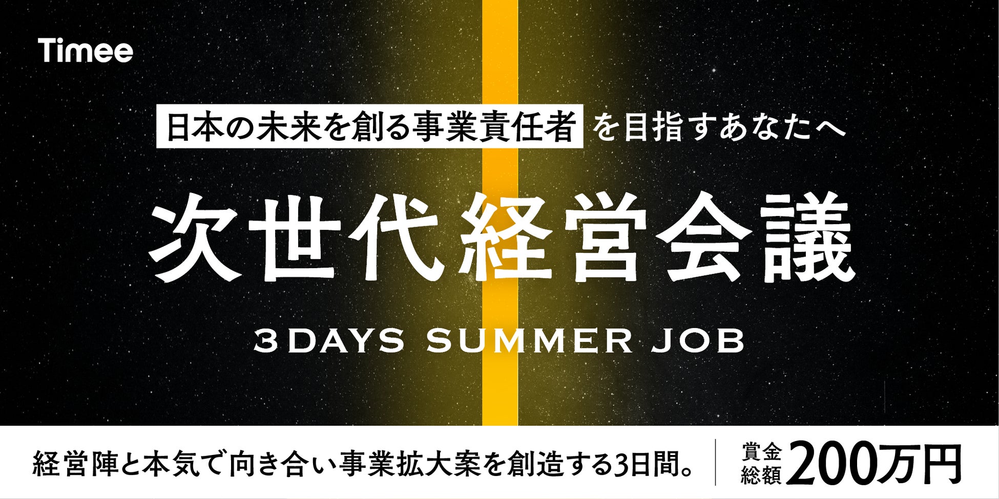 スキマバイトサービス「タイミー」を提供する株式会社タイミー(所在地:東京都港区、代表取締役:小川 嶺)は、2026年度卒の学生を主な対象とした3days Summer Job「次世代経営会議」を2024年8月23日(金)〜25日(日)に開催します。