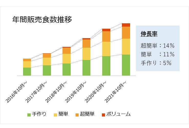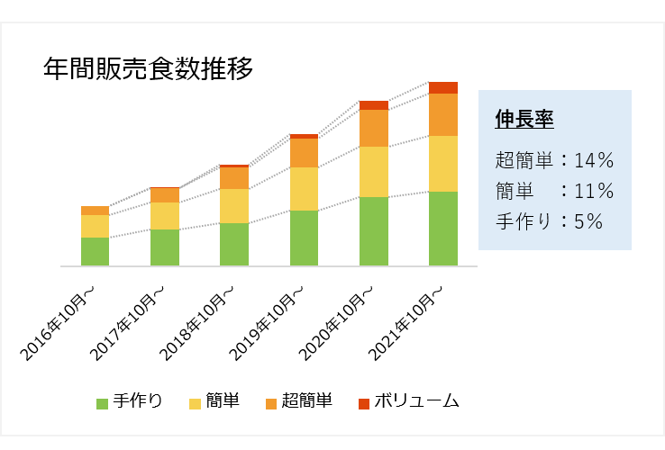 そんな中、ヨシケイでは調理師不在でも湯煎や解凍で誰でも作れる『簡単おかず』や『超簡単おかず』の人気が上昇。年間販売食数の伸長率は、『手作りおかず』が5%だったのに対し、『簡単おかず』では11%、『超簡単おかず』では14%となりました。