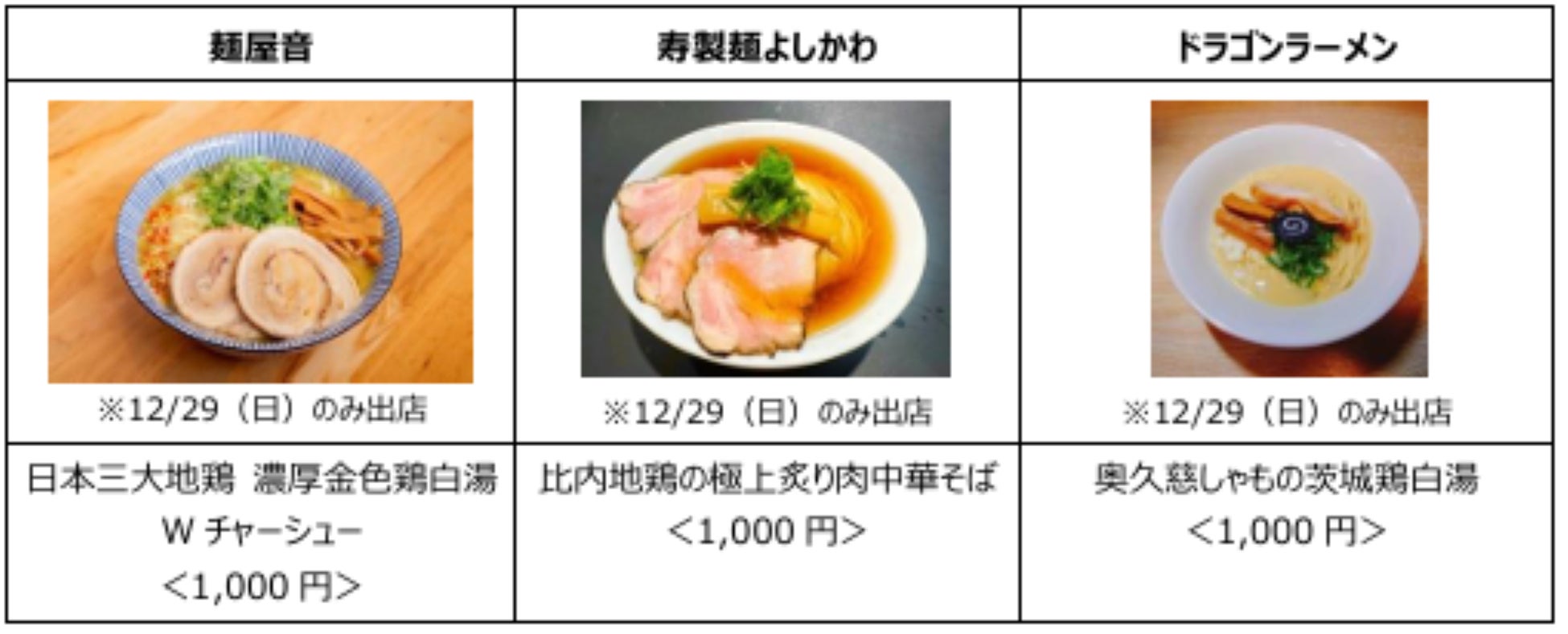 東京大賞典(GⅠ)当日を含む12月29日(日)から31日(火)までの3日間、年末開催の風物詩だった「ラーメンフェス」を5年ぶりに実施します。大阪の名店「金久右衛門」や東京の人気店「ラーメン 巌哲」をはじめ全国の人気ラーメン11店舗(※)がTCKに集結します。さらに、競馬観戦のお供にピッタリなおでんやチャーシュー串などサイドグルメも多数取り揃えております。熱いレースの後は、美味しいラーメンをぜひお楽しみください。