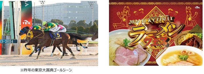 東京シティ競馬(TCK)では2024年最後の開催となる第14回開催を実施します。前半3日間(12/25~12/27)は2024年最後となるトゥインクルレースを実施。後半3日間(12/29~12/31)は29日(日)に行われるダート競馬の総決算「東京大賞典(GⅠ)」をはじめ、30日(月)の「東京シンデレラマイル(SⅢ)」、31日(火)の「東京2歳優駿牝馬(SⅠ)」まで恒例の3日連続重賞を実施します。さらに5年ぶりに帰ってきたTCK年末開催恒例のグルメイベント「ラーメンフェス」を後半の3日間に実施するほか、年末3重賞にあわせた予想ステージやオリジナルグッズのプレゼントなどイベント盛りだくさんでお届けします。レースを観て、食べて、飲んで、2024年の年忘れはTCKでお楽しみください。