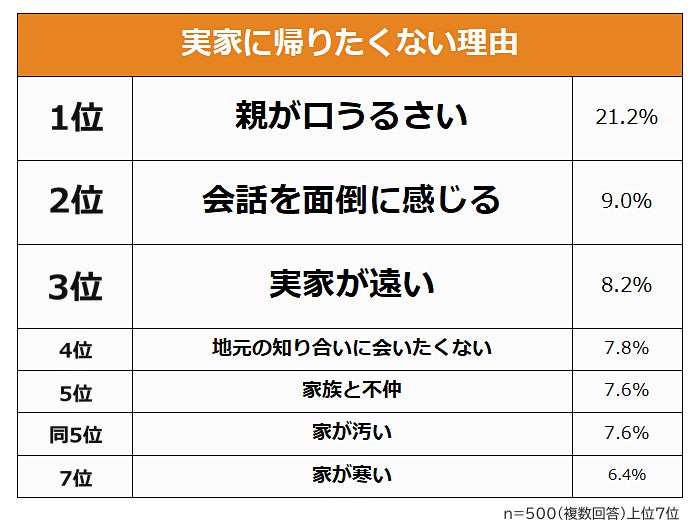 【実家に帰りたくない理由ランキング】男女500人アンケート調査