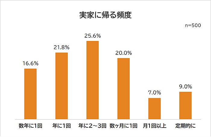 実家に帰りたくないと感じることがある500人に、帰省の頻度を聞きました。その結果、最も多かった回答は「年2~3回(25.6%)」でした。日本では「お盆とお正月くらいは帰省する」という人が多いからだと考えられます。