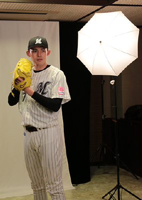 192cmの長身ユニフォーム姿で登場した佐々木選手は「よろしくお願いします!」と爽やかにスタッフに挨拶しながらスタジオ入り。撮影の説明をじっくり聞きながら、目薬をさすポーズや目線の位置など一つひとつ丁寧に確認している様子でした。カメラ前ではCM監督の「挑むような目線で」の言葉にきりっとした表情を浮かべ、試合さながらのピッチングフォームを見せてくれる一面も。休憩時間には、屈託のない笑顔でスタッフと談笑するなど和やかな雰囲気の中、撮影を終えました。