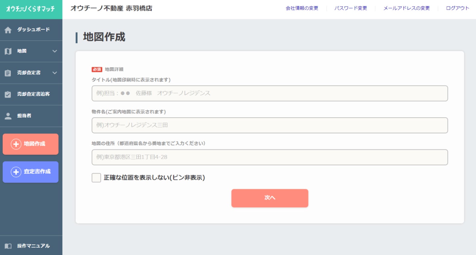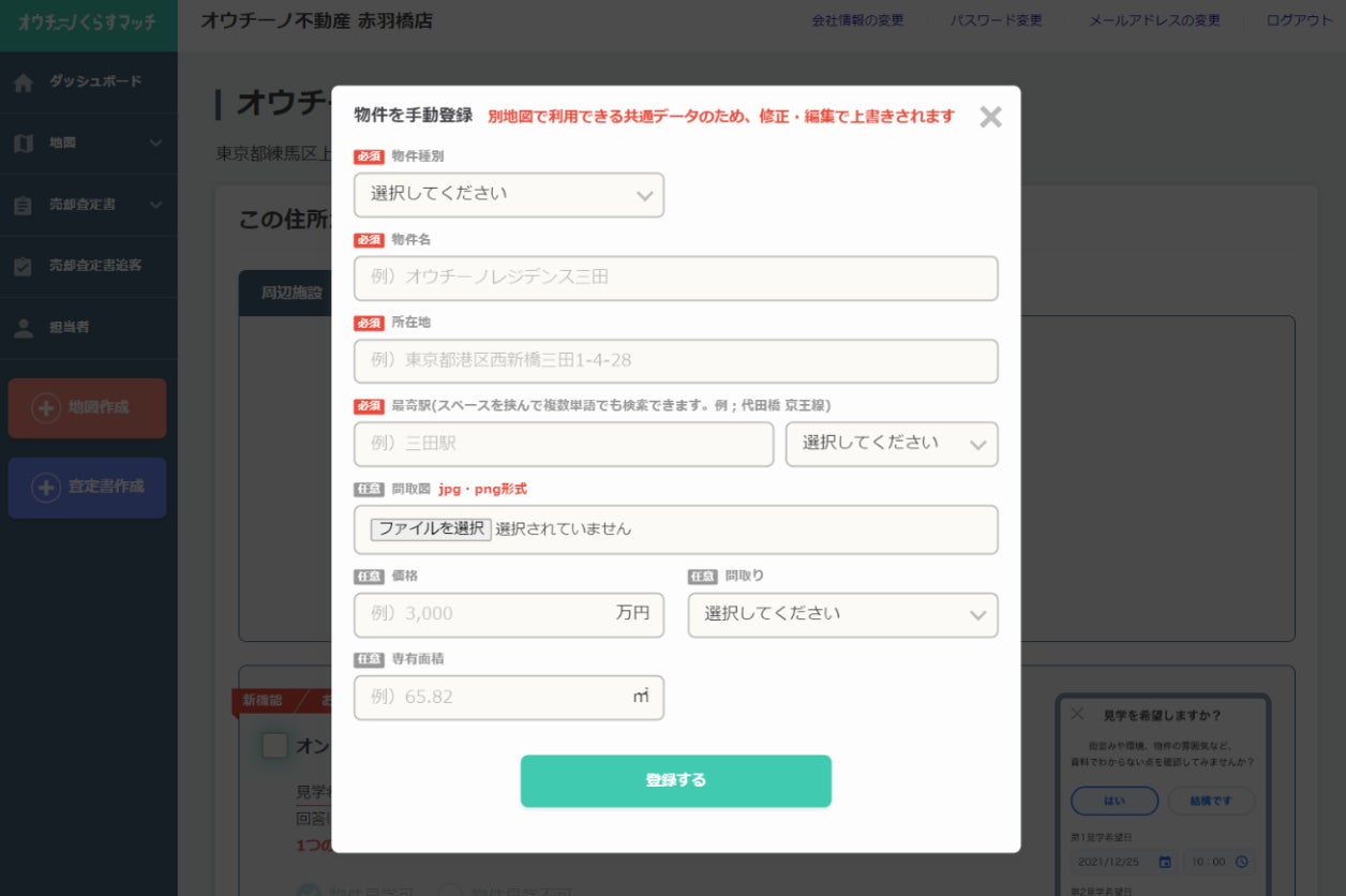 1. 「オウチーノ くらすマッチ」にログイン後「地図作成」をクリックし、 物件名や住所を記載します。